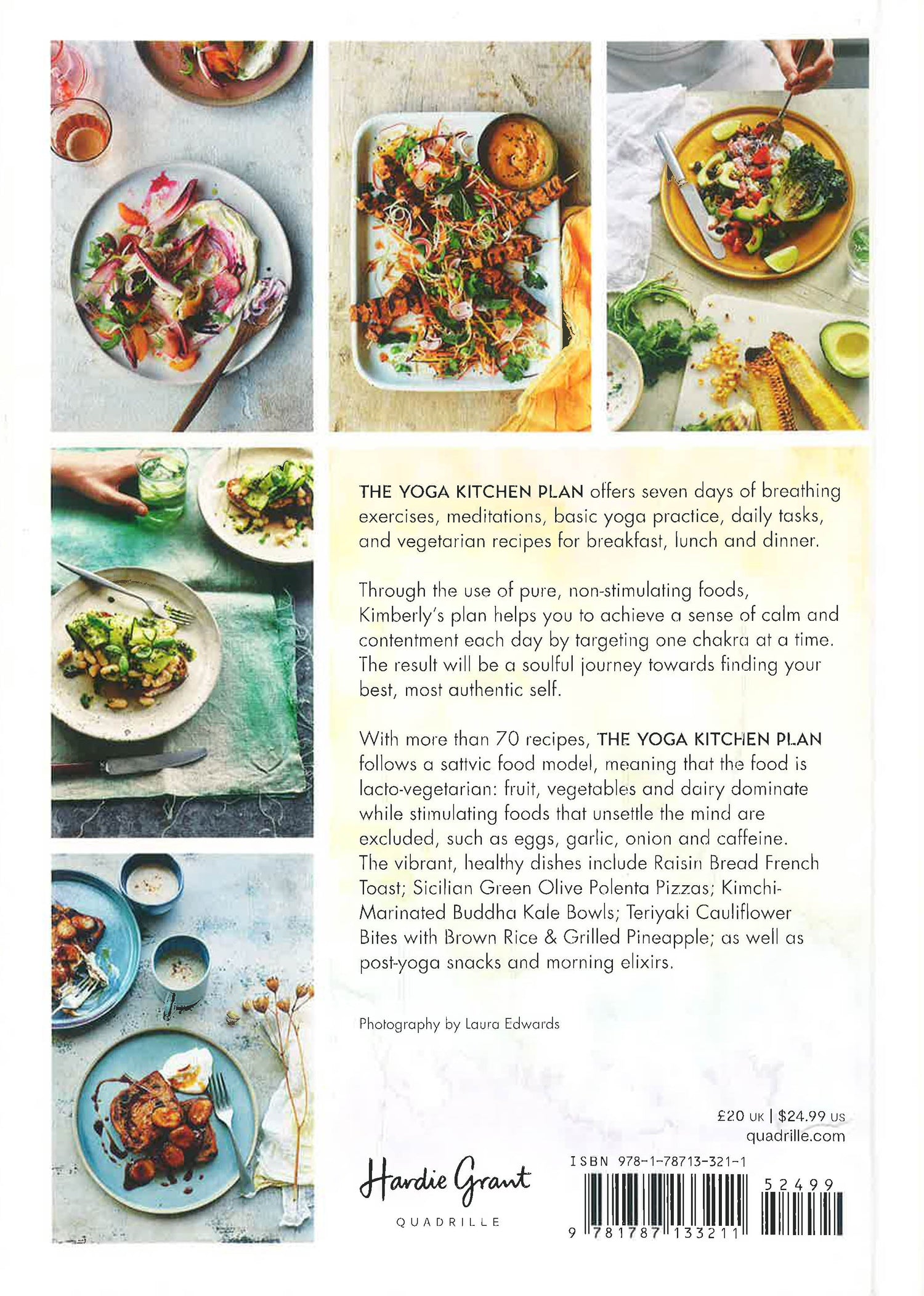 The Yoga Kitchen Plan is a soulful journey towards finding your best, most authentic self where a quiet mind and overall sense of calm is the ultimate goal. Through the use of non-stimulating foods, the plan helps the reader reach a state of bliss and tranquility each day. The book starts by explaining the body's chakra system and how this is integral to a yogic lifestyle. The core of the book is the simple, 7-day plan which incorporates breathing exercises, meditations, basic yoga practice, daily tasks, and then a selection of recipes for breakfast, lunch and dinner that target each of your 7 chakras to take you through a whole week. The 65 recipes follow a sattvic (pure) food model – this means that the food is lacto-vegetarian i.e. fruit, vegetables and dairy predominate while stimulating foods that unsettle the mind are excluded, such as eggs, garlic, onion and caffeine. Examples include Raspberry and Apple Bircher with Pistachio Confetti, Blueberry and Basil Kombucha with Poached Pear and Rhubarb, Feta Whipped Ricotta with Balsamic, Fennel, Beetroot and Orange Salad, and Smoky Grilled Romaine Lettuce, Corn and Black Bean Salad.