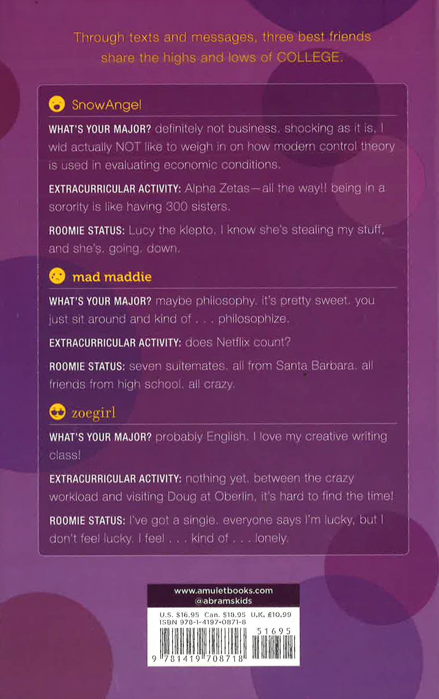 Through texts and messages, the mega-bestselling, beloved Internet Girls series followed the ups and downs of school for three very different, very close friends. Now it's freshman year of college for the winsome threesome, and *everything* is different. For one, the best friends are facing their first semester apart. Way, way apart. Maddie's in California, Zoe's in Ohio, and Angela's back in Georgia. And it's not just the girls who are separated. Zoe's worried that Doug wants to break up now that they're at different schools, and Maddie's boyfriend, Ian, is on the other side of the country.In the face of change and diverging paths, Maddie's got a plan to keep the friends close, and it involves embracing the present, making memories, and . . . roller derby! Using of-the-moment technology, Lauren Myracle brings her groundbreaking series into the brave new virtual world of texting and tweets.Praise for yoloSTARRED REVIEW "This honest, nuanced, accessible, and credible account provides teen girls with an authentic and skillfully told description of college life. The story, which can stand independently from the rest of the Internet Girls series, offers readers realistic, engaging, and provocative perspectives on scary first semesters away from home and sage advice about drinking, partying, and shutting down socially, all without ever leaving the perfectly crafted text-message flow. --Booklist, starred review "Funny, deceptively smart and just in time for those going off to college." --Kirkus Reviews