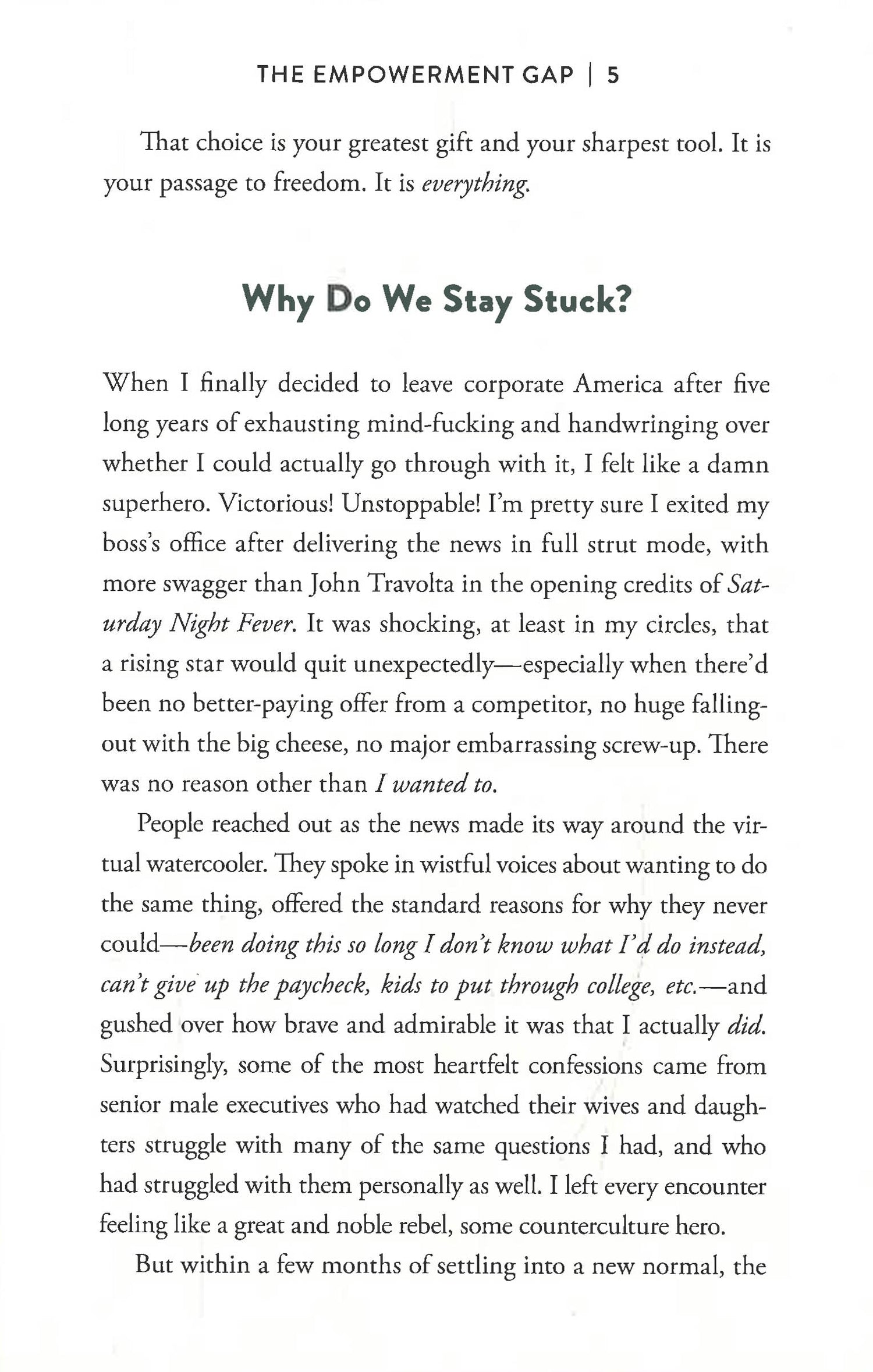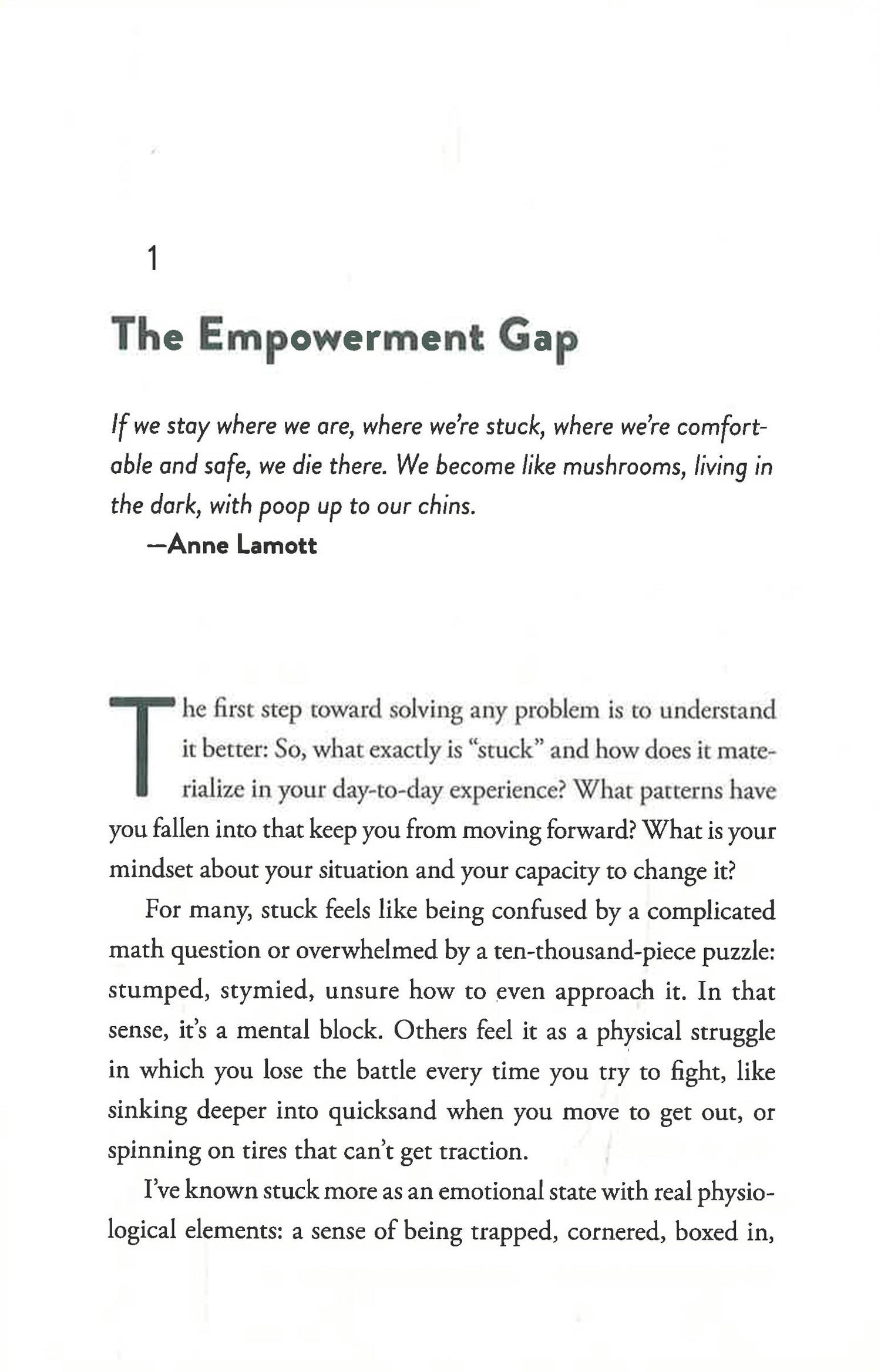 You Are Not Stuck is the key to breaking the cycle of fear and making bold choices for real change. Sometimes this transformation looks like an audacious Thelma and Louise-style leap; more often, though, it is a series of small, deliberate actions based on personal values that yield more clarity, alignment, and, ultimately, long-term contentment than driving off a cliff.