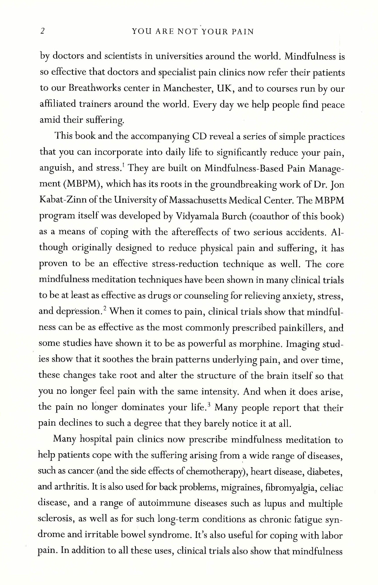 Developed by two authors, Vidyamala Burch and Danny Penman who themselves have struggled with severe pain after sustaining serious injuries, You Are Not Your Pain reveals a simple eight-week program of mindfulness-based practices that will melt away your suffering. Accompanied by a CD to guide you, the eight meditations in this book take just ten to twenty minutes per day and have been shown to be as effective as prescription painkillers to soothe some of the most common causes of pain. These mindfulness-based practices soothe the brain's pain networks, while also significantly reducing the anxiety, stress, exhaustion, irritability, and depression that often accompanies chronic pain and illness.