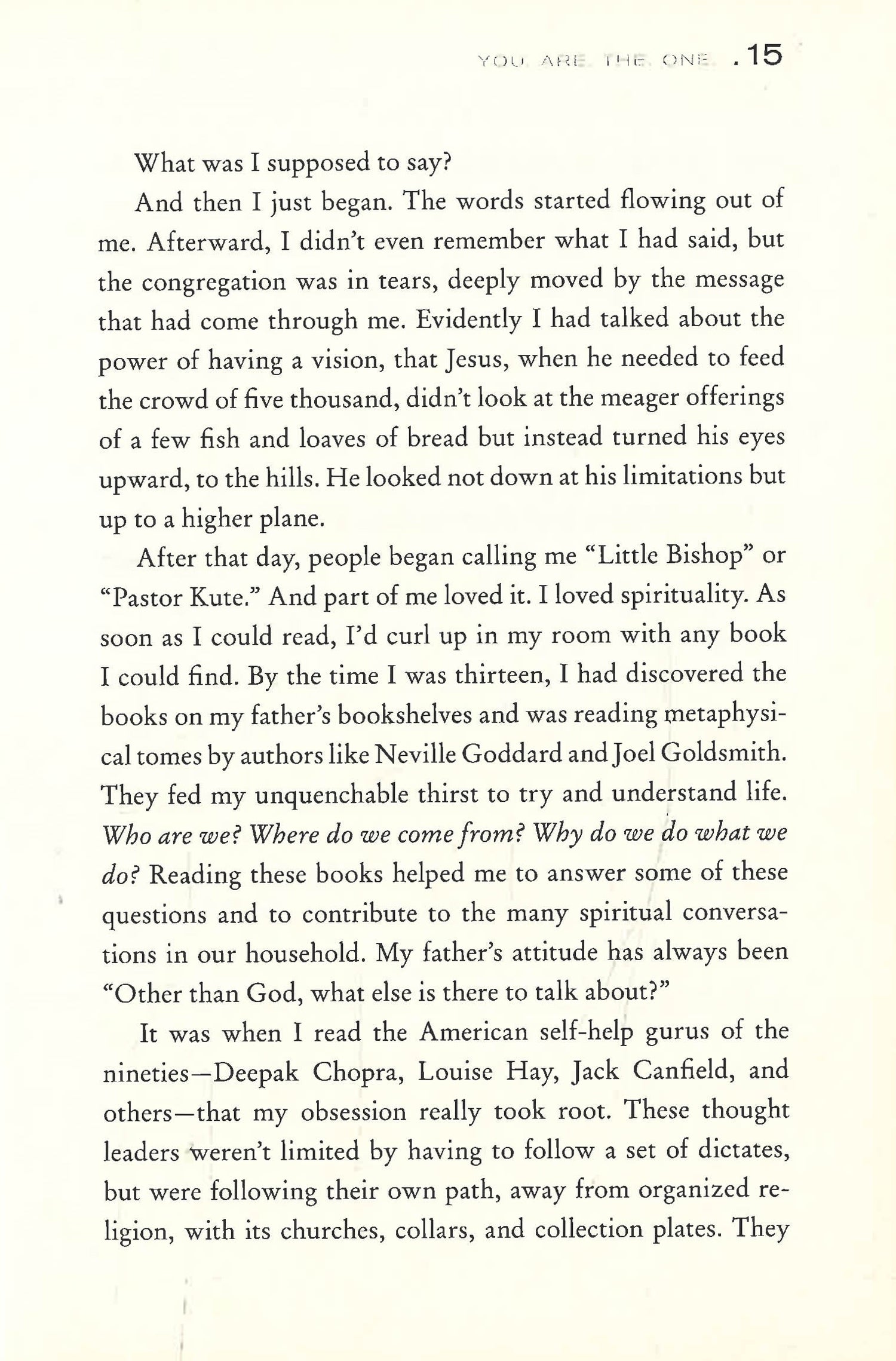 A charismatic visionary and transformational teacher offers a bold new look at spiritual awareness providing the tools needed to live a life truly inspired by love for a whole new generation. Kute Blackson comes from a long line of spiritual leaders and works with people from all walks of life, offering his own uniquely powerful process to transform lives from the inside out. His inspirational and life-changing YouTube videos, seminars, and conferences are known throughout the world, but it's his trademark transformation experiences that sets him apart. The intensive one-on-one and one-of-a-kind transformational mother of all trips is a 14-day, 24/7 journey into the heart of India where the client--armed with nothing but a backpack, a change of clothes, and a journal--works with Blackson until he discovers what he hasn't yet found. Whether it's about forgiveness, confronting inner demons, letting go of self-hatred or the scars of the past, those hard-earned, sweat-proof lessons Blackson instills in his clients are right here, in this book, You Are The One. No need to pack your bags or renew your passport. So what are you waiting for? For someone to save you? If so, you're not alone. But it's not going to happen. Your parents won't rescue you. Your friends won't carry you. No one's coming. Know why? Everything you are seeking is within you already. Because you're already here. You. Are. The. ONE. You Are The One is a reflection of Blackson's unique and distinctive thoughts, teachings, stories, and poetic inspirations to help you access your true power and live boldly and fully in the world--with no regrets.