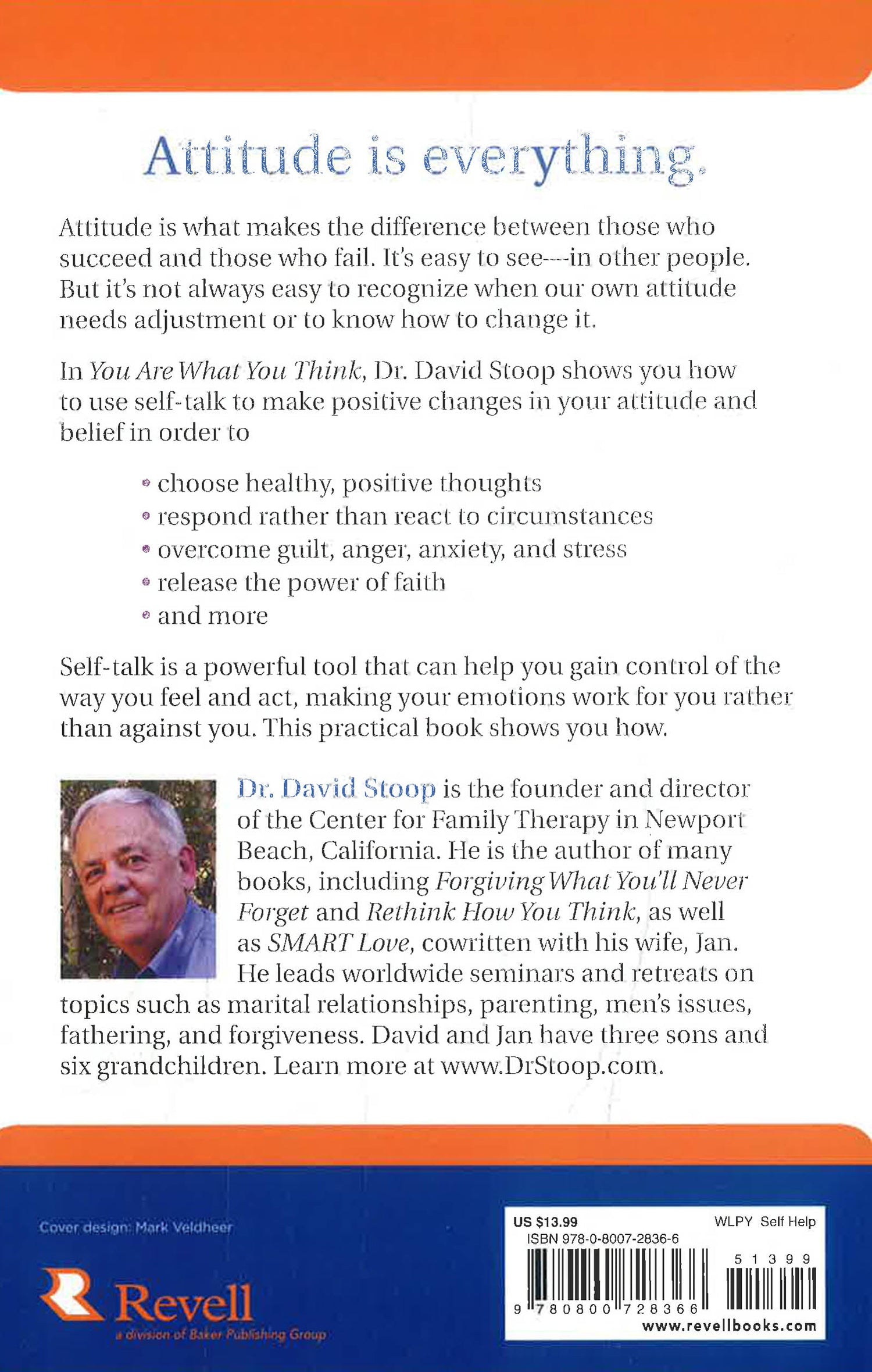 Attitude is everything. Attitude is what makes the difference between those who succeed and those who fail. It's easy to see--in other people. But it's not always easy to recognize when our own attitude needs adjustment or to know how to change it. In You Are What You Think, Dr. David Stoop shows readers how to use self-talk to make positive changes in their attitudes and beliefs in order to - choose healthy, positive thoughts - respond rather than react to circumstances - overcome guilt, anger, anxiety, and stress - release the power of faith - and more We can use self-talk to gain control of the way we feel and act. We can turn out-of-control into self-control and make our emotions work for us rather than against us. You Are What You Think explains how.