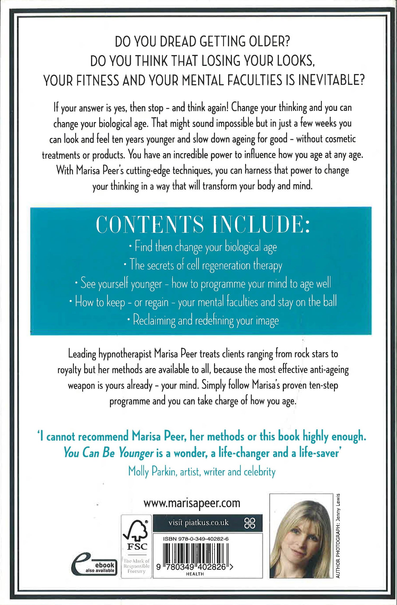 The way we look and feel has very little to do with our chronological age: positive thinking and changing your belief system are the most important factors in staying young. In this exciting new book, leading therapist Marisa Peer explains how you can arrest the ageing process by harnessing the power of your subconscious mind. By changing your thinking, you can change your body and become physically and mentally at least ten years younger. You Can Be Younger contains a ten-step programme to teach you how to: Retrain your mind so you can stay young and vibrant Use Marisa's cell regeneration therapy to counteract the ageing process Boost energy and visibly improve your skin's appearance Marisa Peer shares the secrets her celebrity clients know so that you too can look and feel more youthful.