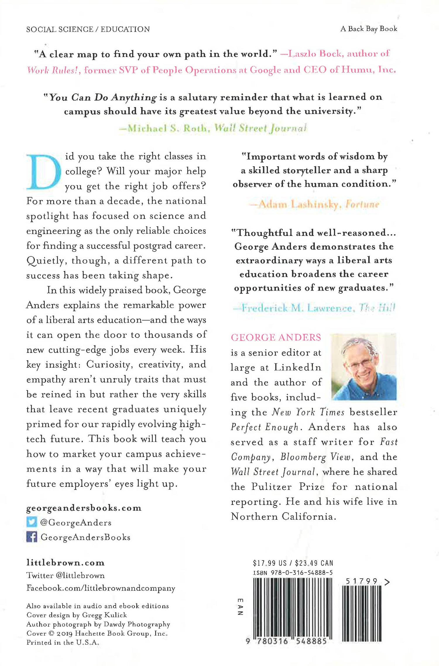 George Anders's YOU CAN DO ANYTHING is shaped by the insight that the leading lights at so many ostensibly "tech" firms have deep backgrounds in the humanities--history, sociology, and, yes, English. Something about those backgrounds unlocked potential that hordes of anonymous MBAs and BSs can only wish for.