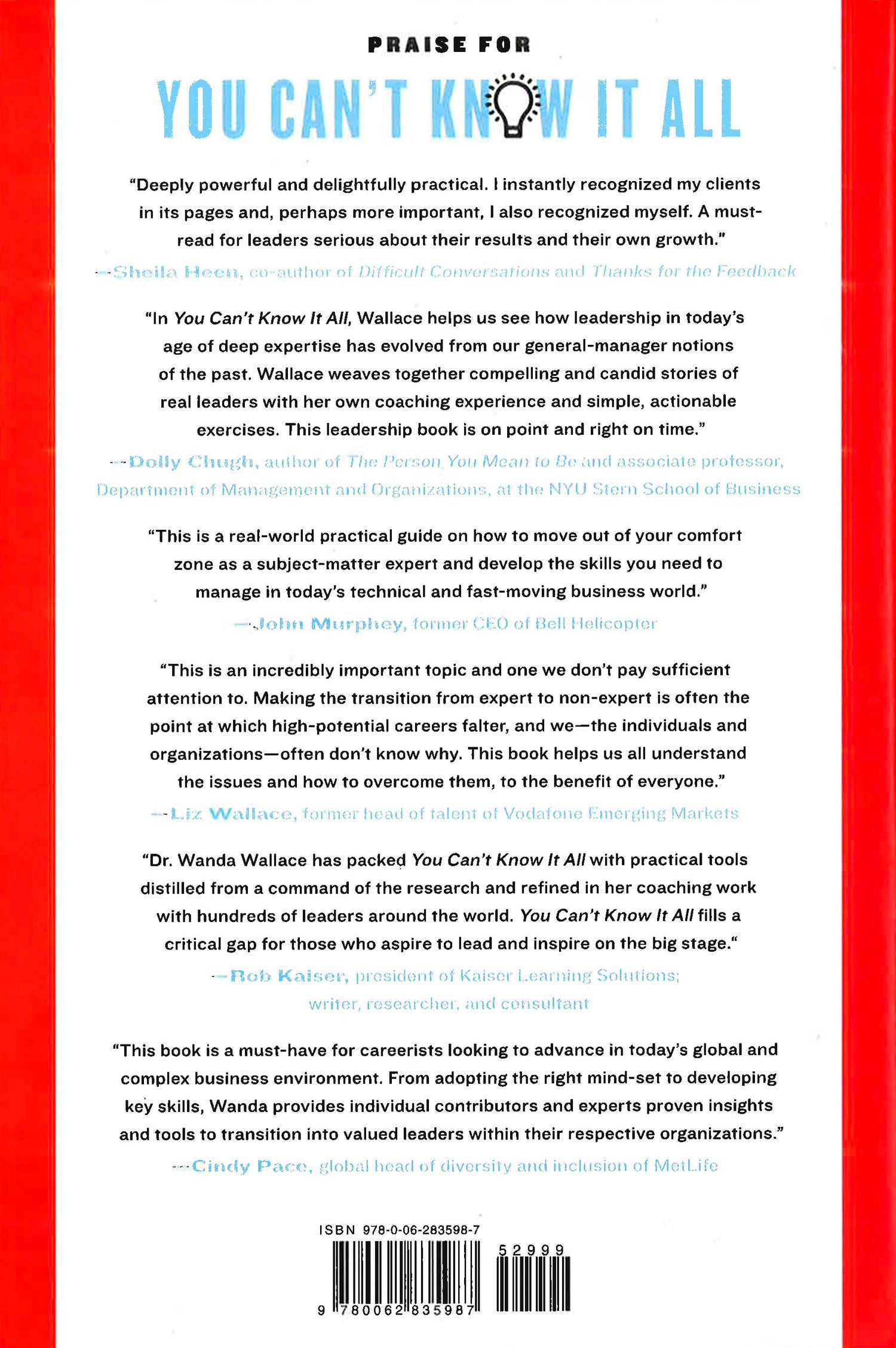 In You Can't Know It All, Wallace presents the coaching model she has developed to address the challenges of this transition. She offers strategies for individuals to navigate their new roles and learn to combine their expertise with their leadership responsibilities. She gives essential advice on the fundamental change in mind-set that this requires.
