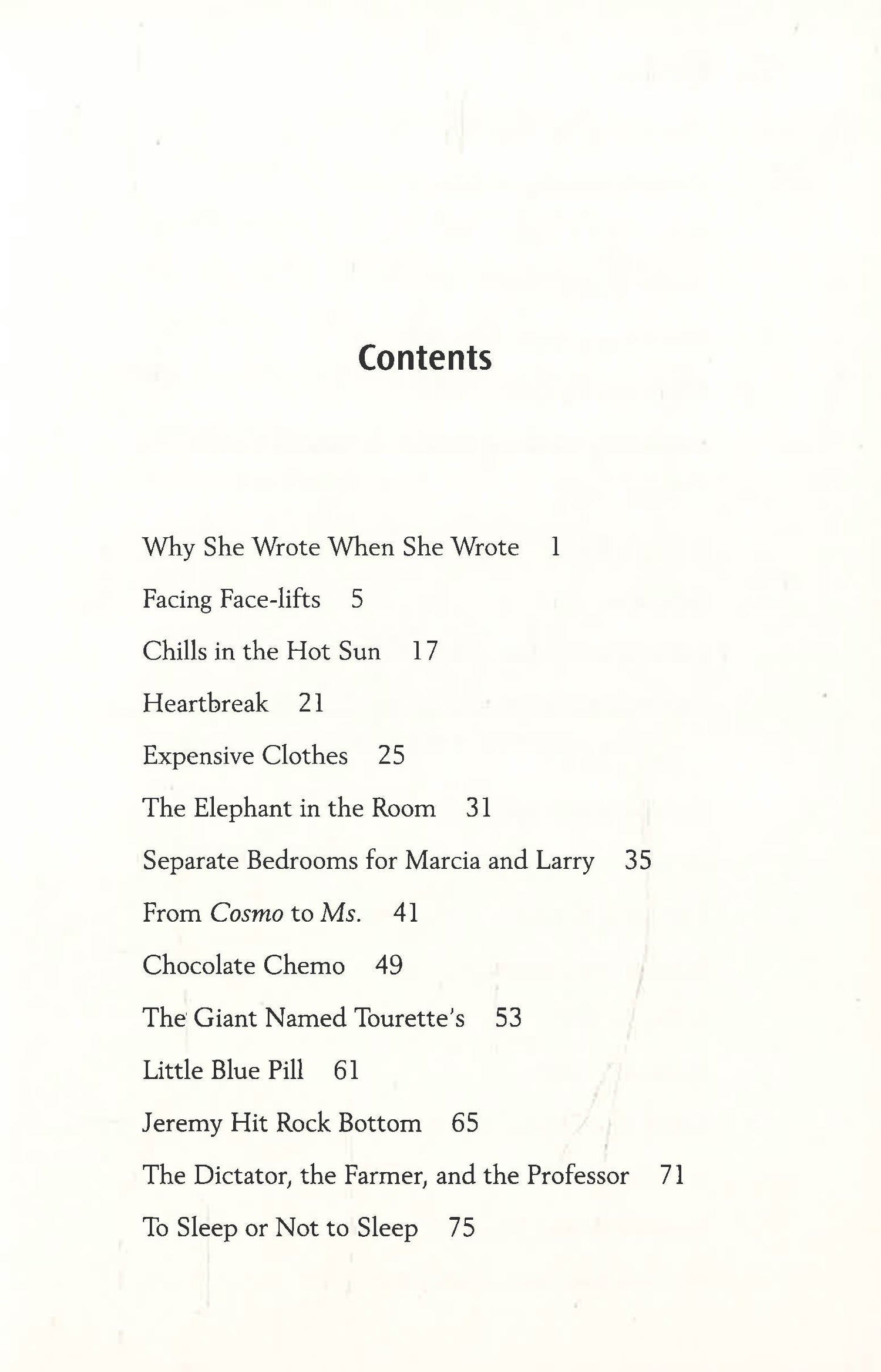 In these pages you will read about the real life challenges of being a woman in a man's world, what it means to be a working mother, what it's like to be an older woman in a youth-obsessed culture, the sometimes changing, often sweet truth about marriages, what being a feminist really means, and that you are in good company if your adult children don't return your phone calls.