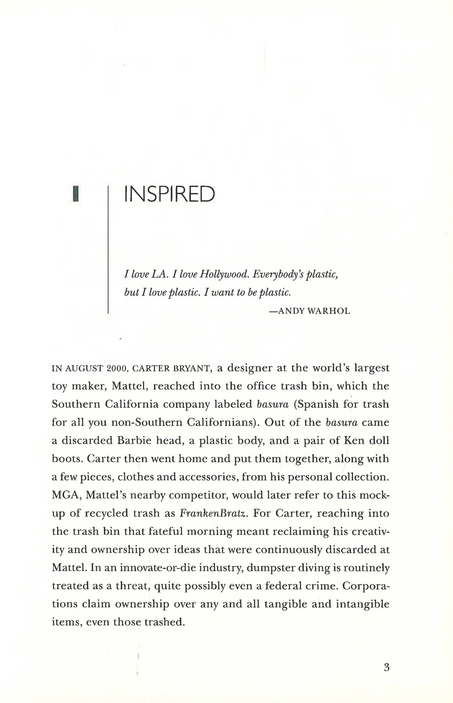 This entertaining and provocative work pits MGA against Mattel, shows how an idea turns into a product and explores the two different versions of womanhood represented by Barbie and her rival. Lobel’s story is a thought-provoking contribution to the debate over creativity and intellectual property as American workers may now be asked to sign contracts granting their employers the rights to and income from their ideas.