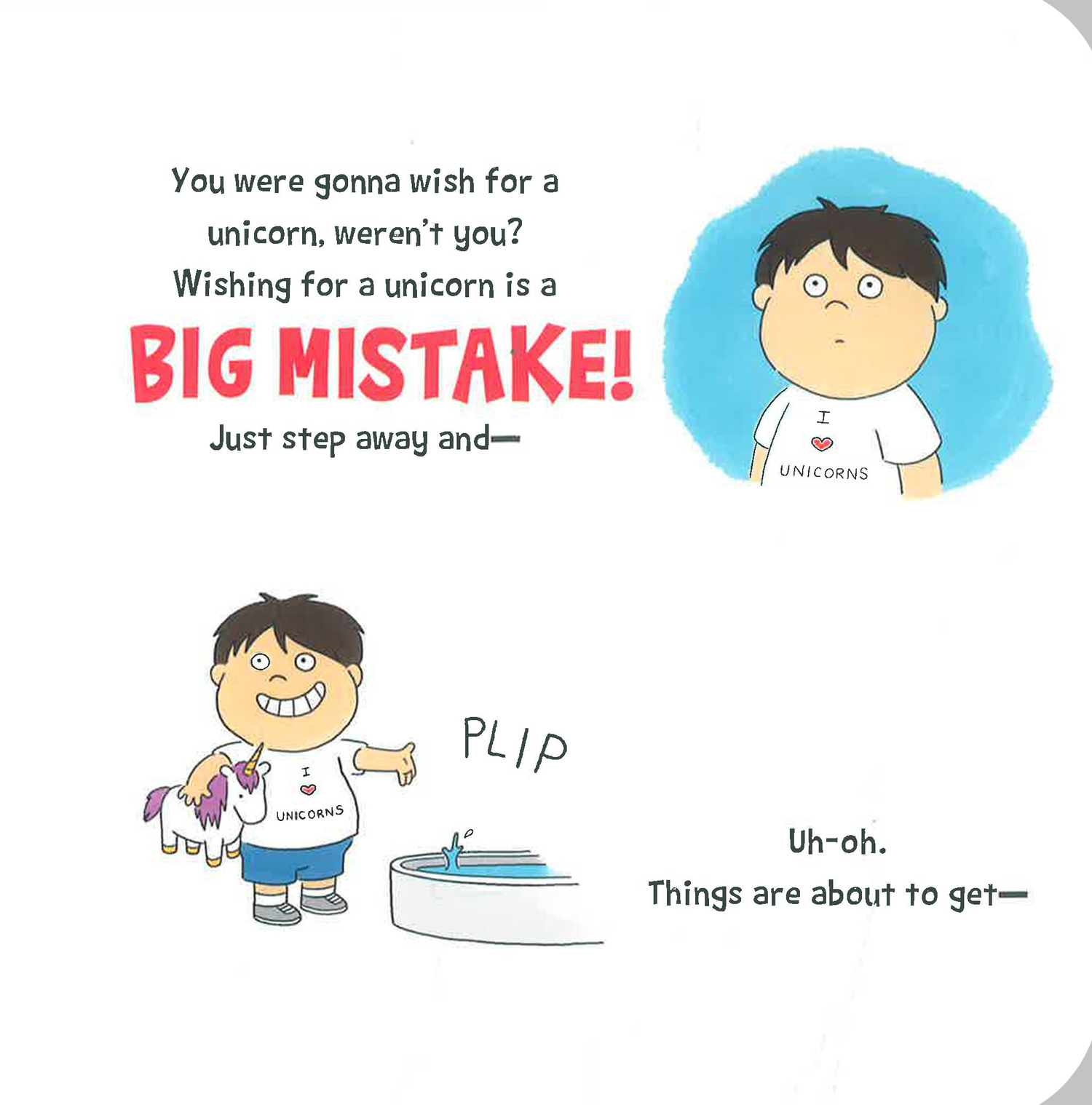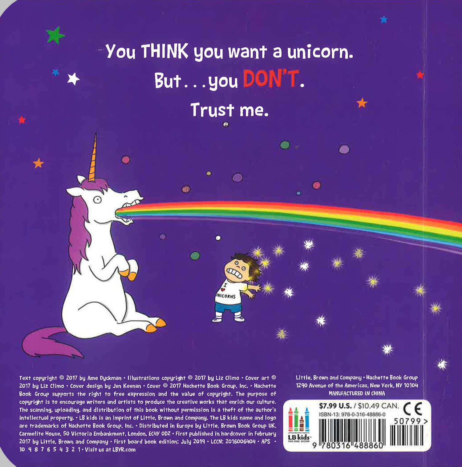 When a little boy throws a coin in a well asking for a pet unicorn, he has no idea what kind of trouble he's in for. Unbeknownst to him, unicorns make the absolutely worst pets: they shed, they poke holes in your ceiling, and they make a big mess. With a knowing wink from Ame Dykeman, creator of Wolfie the Bunny and cheerful illustrations from Rory the Dinosaur creator and Tumblr star Liz Climo, this rollicking story shares all of the ways a pet unicorn can ruin your life, and is sure to have readers in stitches.