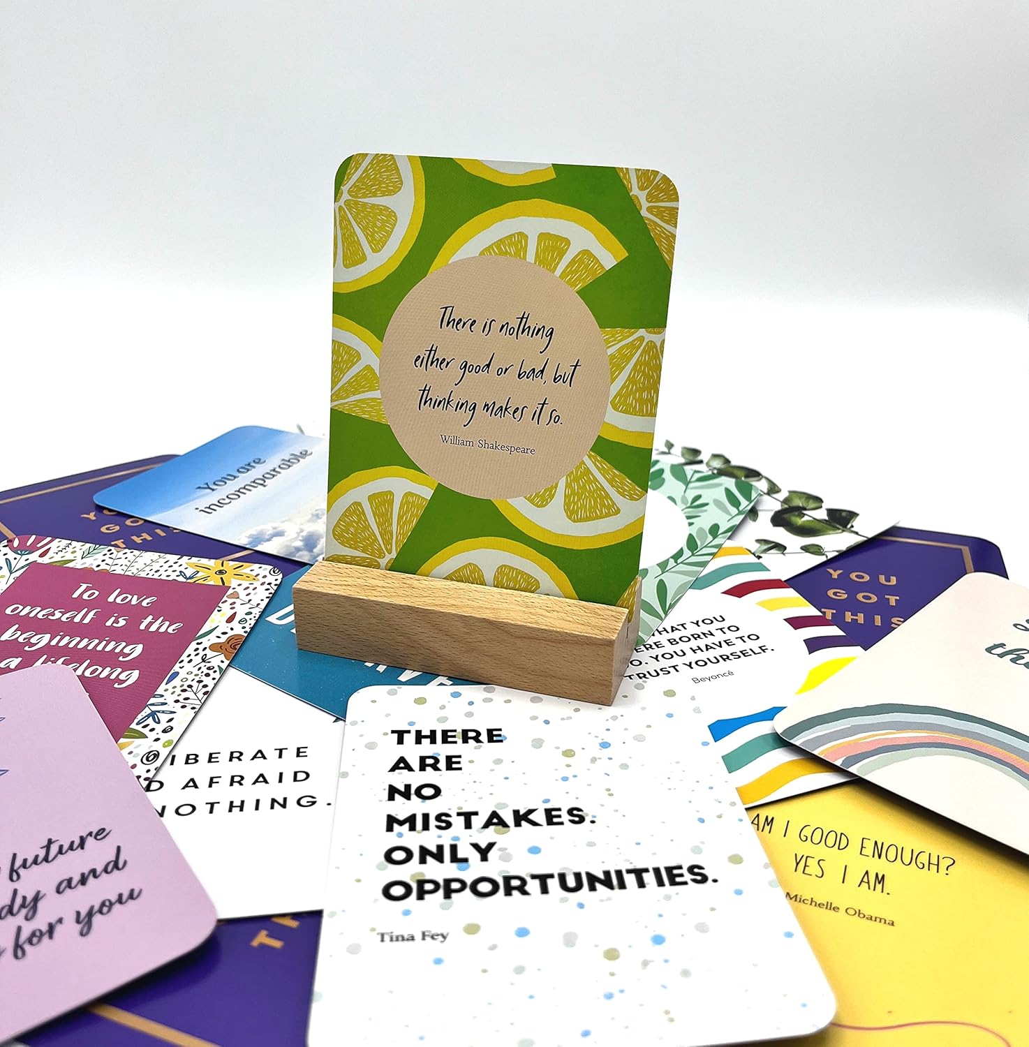 These eye-catching cards and pocket-size booklet come complete with a beautiful wooden stand so that you can display them anywhere you choose. For a powerful boost of self-belief, use these reminders to brighten up your room, your desk or wherever else you like. Simply pick a card, and let it fill you with inner strength!