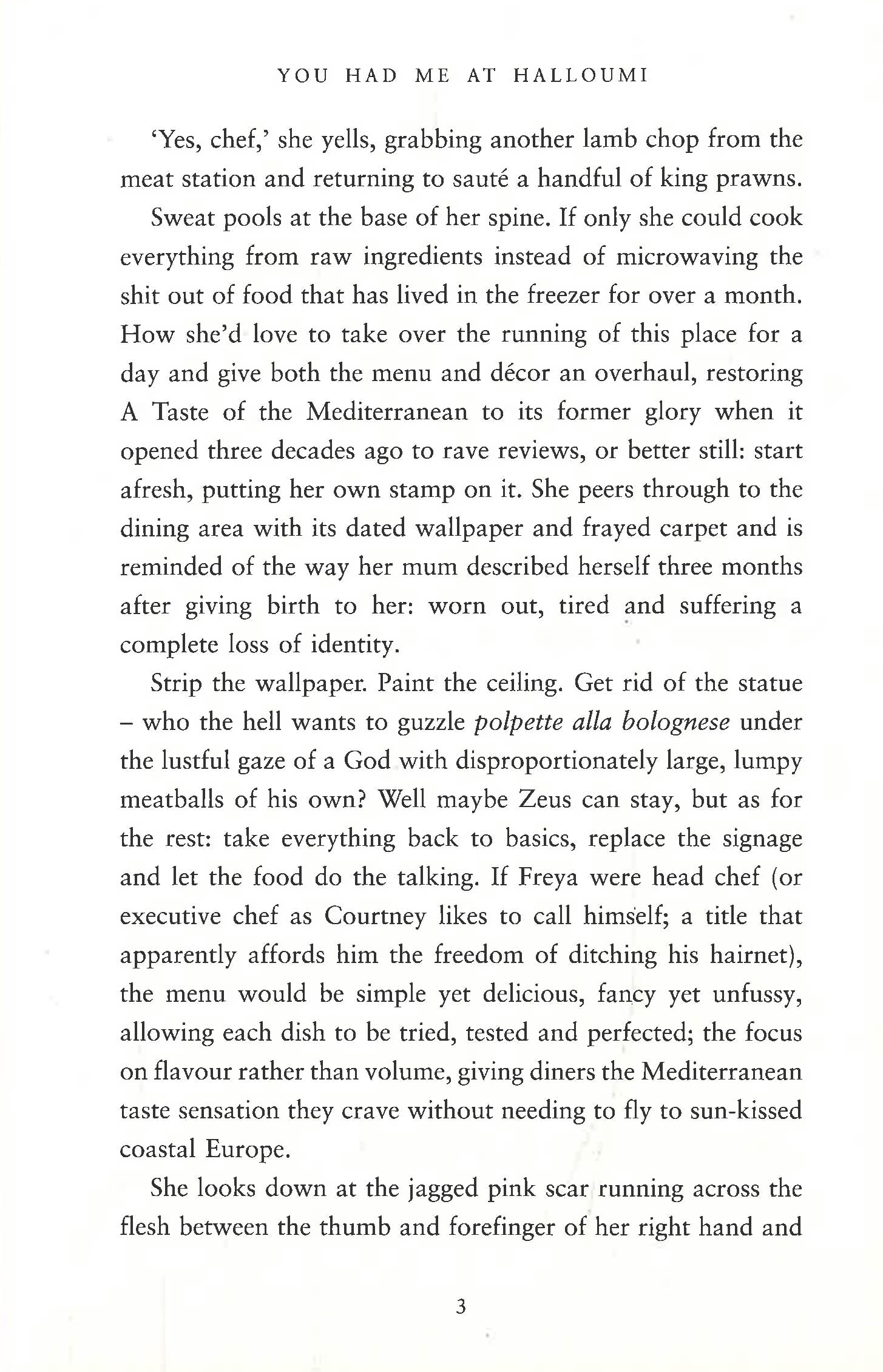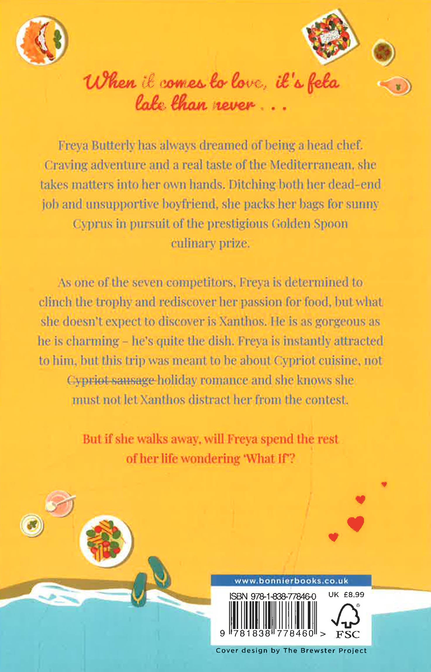Freya Butterly has always dreamt of being a Head Chef but despite running every service at the Mediterranean restaurant, she still doesn't get the recognition she deserves. Craving adventure and a real taste of the Mediterranean, Freya takes matters into her own hands, ditching both her job and unsympathetic boyfriend and packing her bags for sunny Cyprus in pursuit of the prestigious Golden Spoon culinary award. As one of the seven competitors, Freya is determined to rediscover her passion for food and clinch the prize, but what she doesn't expect to discover is Xanthos. As gorgeous as he is charming - he's quite the dish - and Freya is instantly attracted to him, but this trip was about Cypriot cuisine, not Cypriot sausage romance and she knows she must not let Xanthos distract her from the competition. But if she walks away, will Freya spend the rest of her life wondering What If? Surely, it's feta late than never . . .