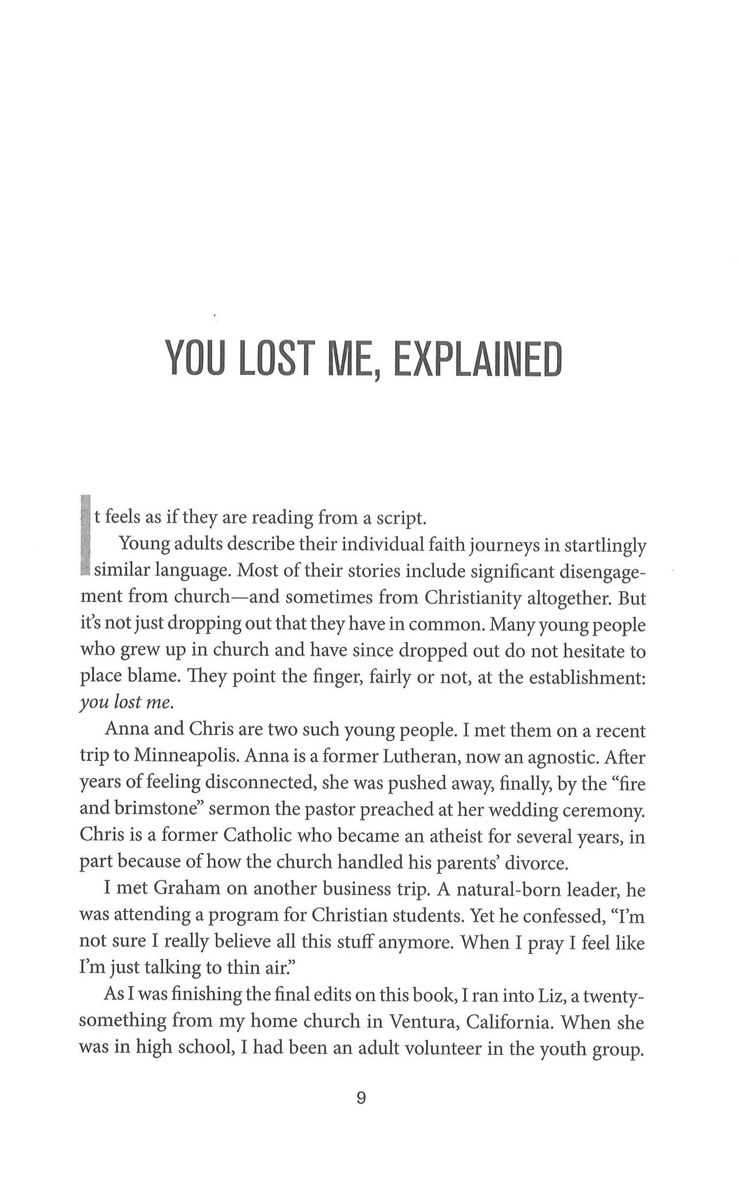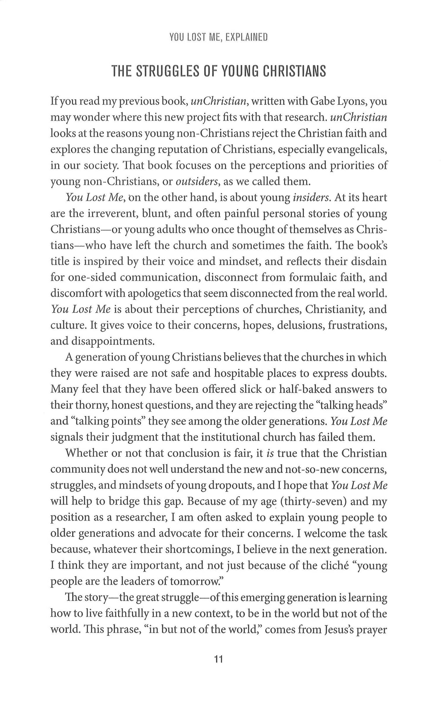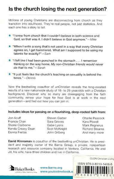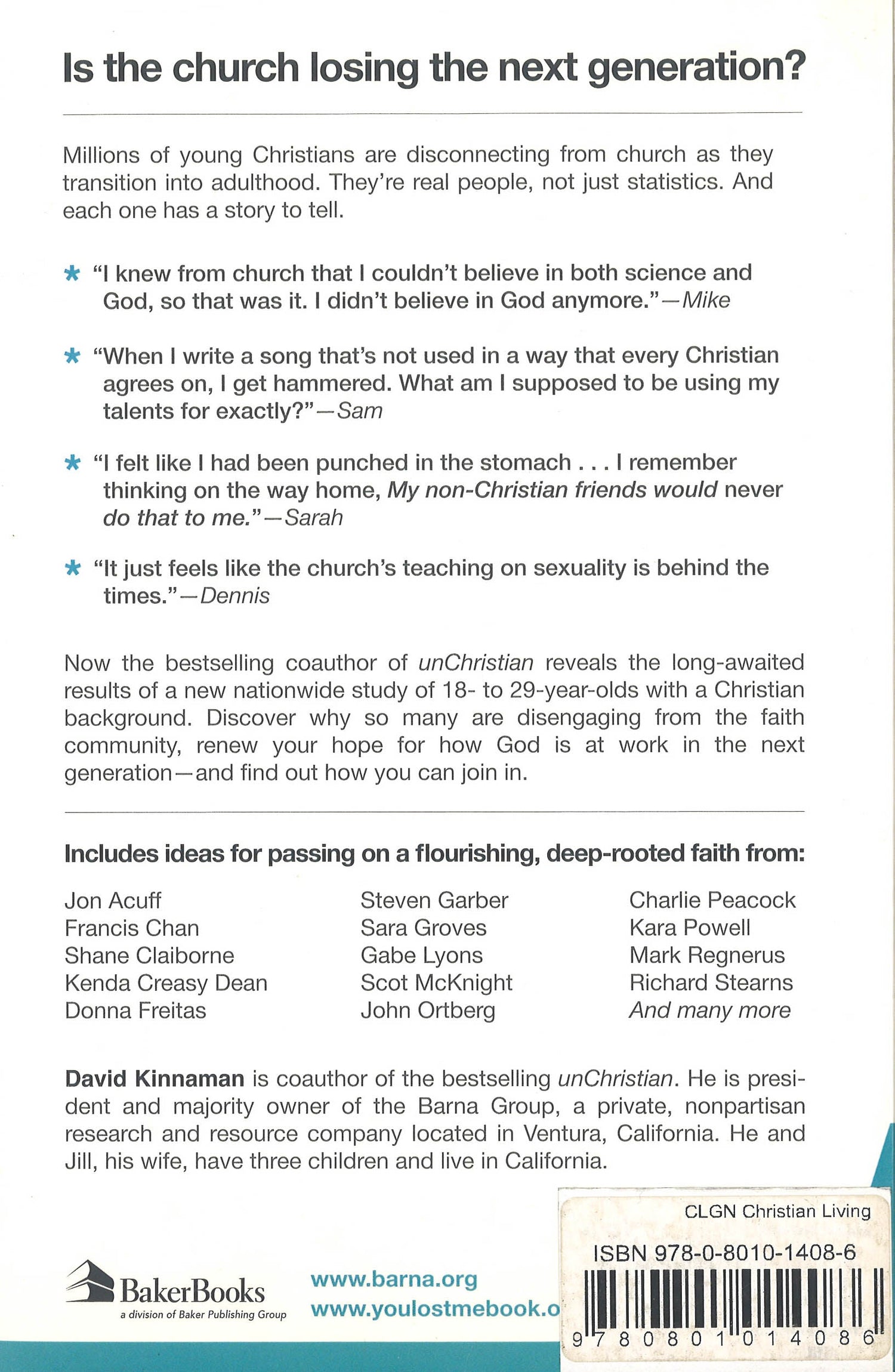 More than 60 percent of young people who went to church as teens drop out after high school. This is a striking and alarming statistic. Now the bestselling author of unChristian trains his researcher's eye on these young believers. Where Kinnaman's first book unChristian showed the world what outsiders aged 16-29 think of Christianity, You Lost Me shows why younger Christians, ages 16-29, are leaving the church and rethinking their faith. Based on new research, You Lost Me shows pastors, church leaders, and parents how we have failed to equip young people to live "in but not of" the world and how this has serious long-term consequences. He then offers suggestions on how to help young people develop and maintain a vibrant faith that they embrace rather than toss away.