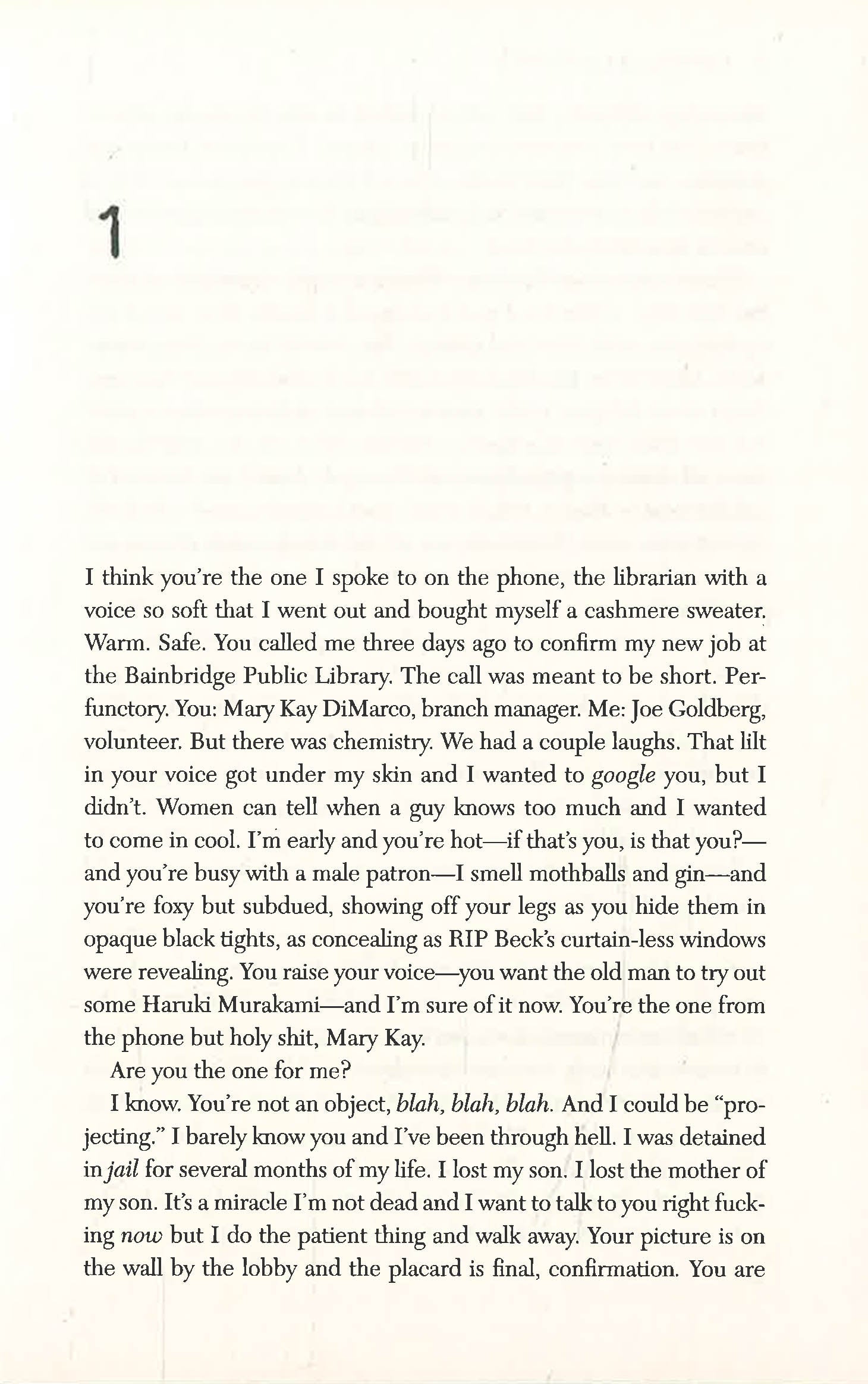 He gets a job at the local library – he does know a thing or two about books – and that's where he meets her: Mary Kay DiMarco. Librarian. Joe won't meddle, he will not obsess. He'll win her the old fashioned way . . . by providing a shoulder to cry on, a helping hand. Over time, they'll both heal their wounds and begin their happily ever after in this sleepy town.