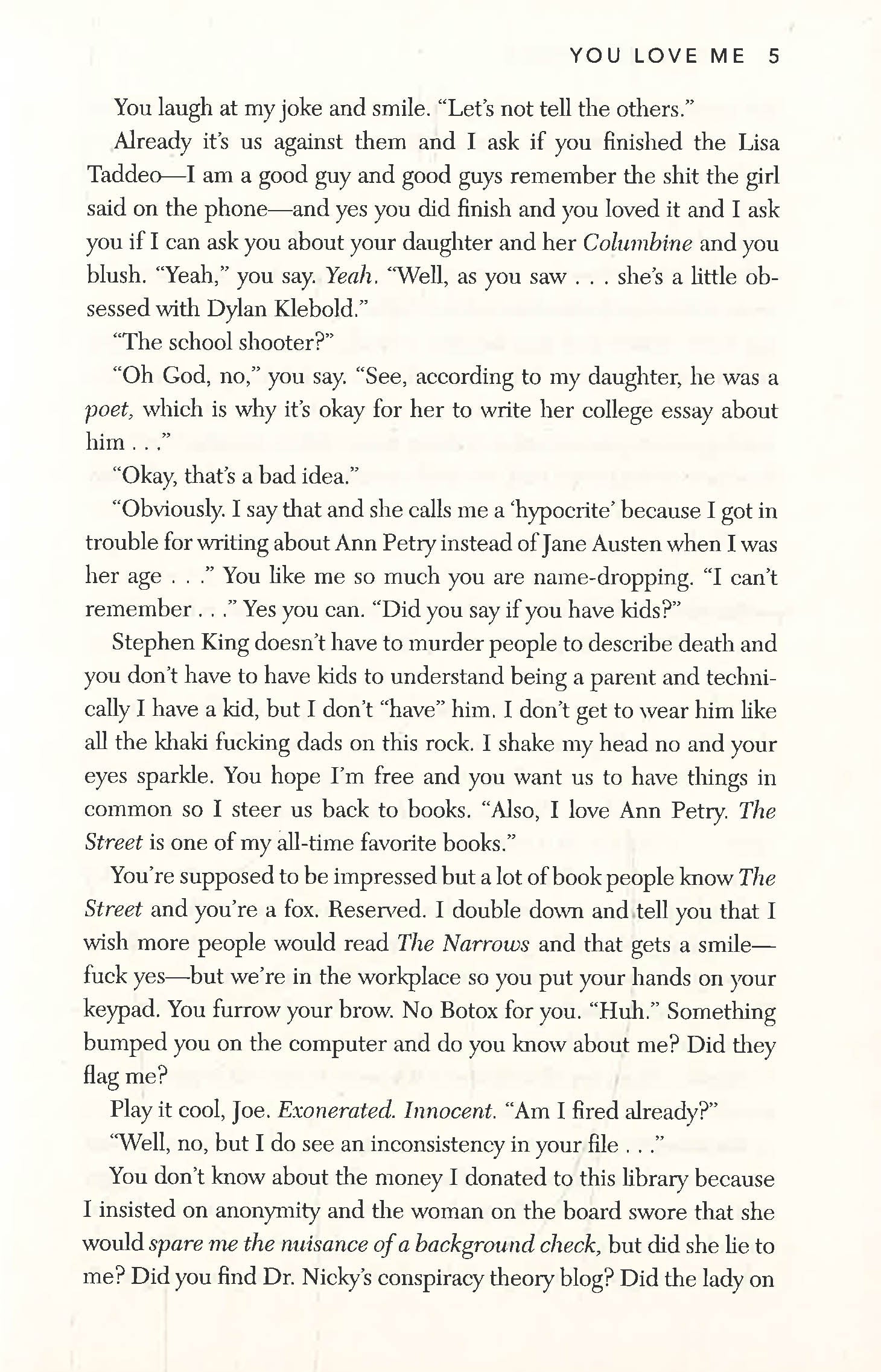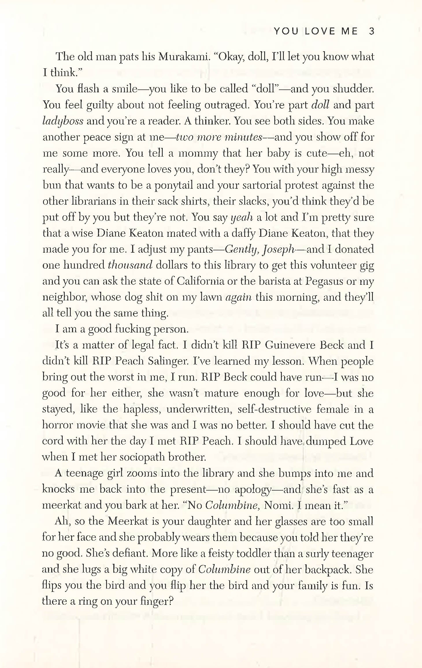 Joe Goldberg is done with cities, done with the muck and the posers, done with Love. Now, he's saying hello to nature, to simple pleasures on a cosy island in the Pacific Northwest. For the first time in a long time, he can just breathe.