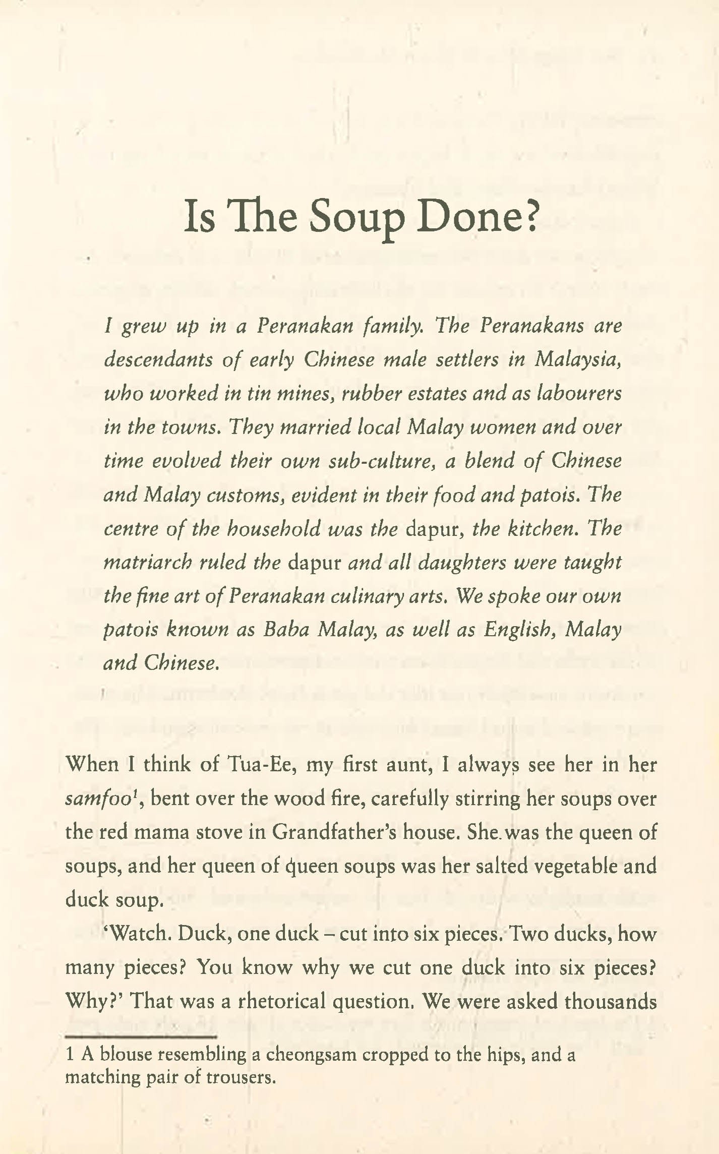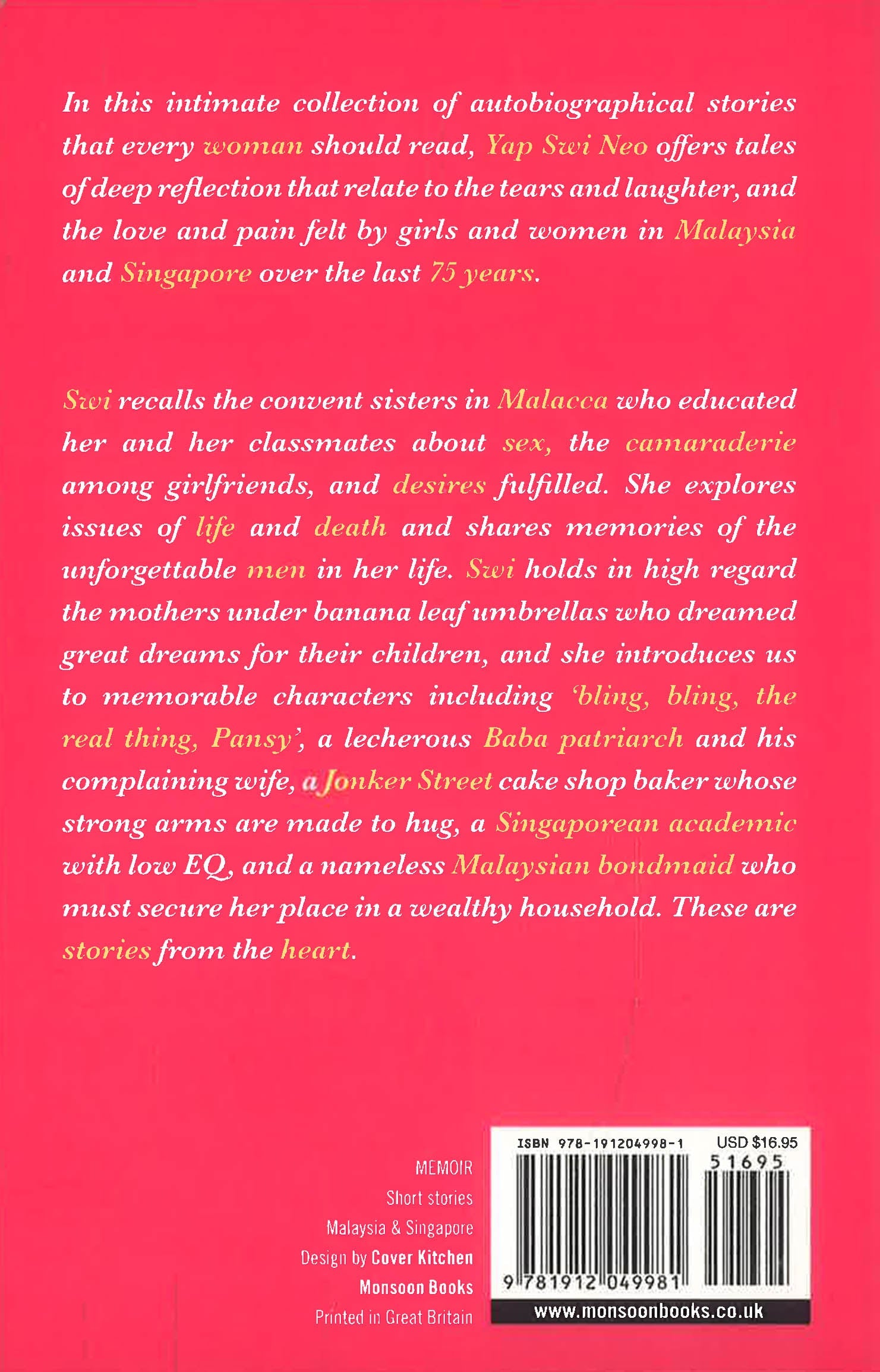 My first aunt, Tua-Ee, left hand on hip, right hand holding a ladle of boiling salted vegetable and duck soup, would administer the test. Looking straight into our eyes, she would ask, "Is the soup done?" If we got it wrong, she scolded us, "Next time, what would your mother-in-law say, ah? Your mother n-e-v-e-r teach you. Where to put your face? So malu!" My cousin and I swore we would never ever get married and live with mothers-in-law who would administer the "Is the soup done?" test and put our mothers to shame. In this intimate collection of autobiographical stories that every woman should read, Swi offers tales of deep reflection that relate to the tears and laughter, and the love and pain felt by girls and women in Malaysia and Singapore over the last 75 years. Swi recalls the convent sisters in Malacca who educated her and her classmates about sex, the camaraderie among girlfriends, and desires fulfilled. She explores issues of life and death and shares memories of the unforgettable men in her life. Swi holds in high regard the mothers under banana leaf umbrellas who dreamed great dreams for their children, and she introduces us to memorable characters inclduing 'bling, bling, the real thing, Pansy', a lecherous Baba patriarch and his complaining wife, a Jonker Street cake shop baker whose strong arms are made to hug, a Singaporean academic with low EQ, and a nameless Malaysian bondmaid who must secure her place in a wealthy household. These are stories from the heart.