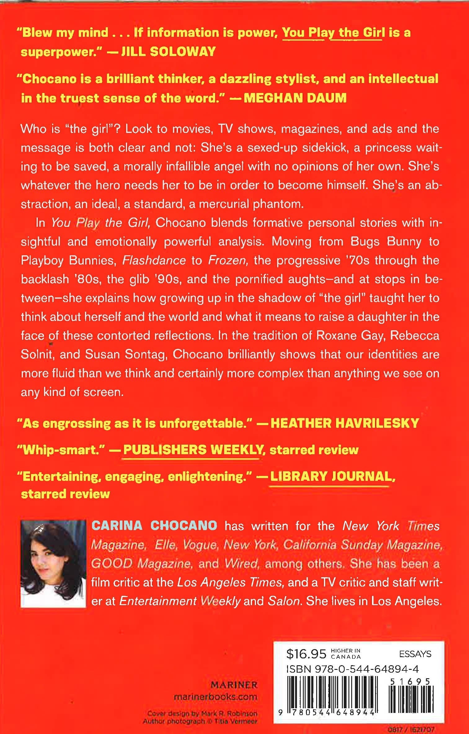 WINNER OF THE NATIONAL BOOK CRITICS CIRCLE AWARD FOR CRITICISM A FINALIST FOR THE PEN/DIAMONSTEIN-SPIELVOGEL AWARD FOR THE ART OF THE ESSAY "If Hollywood's treatment of women leaves you wanting, you'll find good, heady company in You Play the Girl."--ELLE As a kid in the 1970s and 80s, Carina Chocano was confused by the mixed messages all around her; messages that told her who she could be--and who she couldn't. Dutifully absorbing all the conflicting information the culture has to offer on how to be a woman, Chocano grappled with sexed up sidekicks, princesses waiting to be saved, and morally infallible angels who seemed to have no opinions of their own. She learned that "the girl" is not a person, but a man's idea of what a woman should be--she's whatever the hero needs her to be in order to become himself. It wasn't until she spent five years as a movie critic, and was laid off just after her daughter was born, however, that she really came to understand how the stories the culture tells us about what it means to be a girl limit our lives and shape our destinies. She resolved to rewrite her own story. In You Play the Girl, Chocano blends formative personal stories with insightful and emotionally powerful analysis. Moving from Bugs Bunny to Playboy Bunnies, from Flashdance to Frozen, from the progressive '70s through the backlash '80s, the glib '90s, and the pornified aughts--and at stops in between--she explains how growing up in the shadow of "the girl" taught her to think about herself and the world and what it means to raise a daughter in the face of these contorted reflections. In the tradition of Roxane Gay, Rebecca Solnit, and Susan Sontag, Chocano brilliantly shows that our identities are more fluid than we think, and certainly more complex than anything we see on any kind of screen.