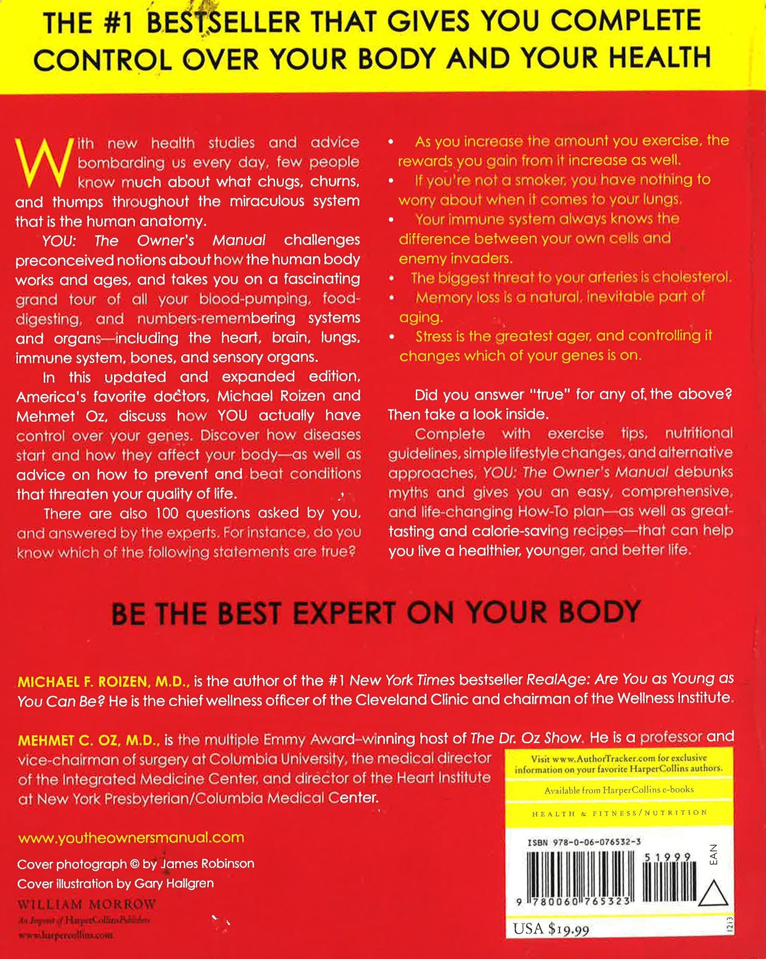 The #1 bestseller that gives YOU complete control over your body and your health. With new health studies and advice bombarding us every day, few people know much about what chugs, churns, and thumps throughout the miraculous system that is the human anatomy. YOU: The Owner's Manual challenges preconceived notions about how the human body works and ages, and takes you on a fascinating grand tour of all your blood-pumping, food-digesting, and numbers-remembering systems and organs--including the heart, brain, lungs, immune system, bones, and sensory organs. In this updated and expanded edition, America's favorite doctors, Michael Roizen and Mehmet Oz, discuss how YOU actually have control over your genes. Discover how diseases start and how they affect your body--as well as advice on how to prevent and beat conditions that threaten your quality of life. There are also 100 questions asked by you, and answered by the experts. For instance, do you know which of the following statements are true? As you increase the amount you exercise, the rewards you gain from it increase as well.If you're not a smoker, you have nothing to worry about when it comes to your lungs.Your immune system always knows the difference between your own cells and enemy invaders.The biggest threat to your arteries is cholesterol.Memory loss is a natural, inevitable part of aging.Stress is the greatest ager, and controlling it changes which of your genes is on. Did you answer "true" for any of the above? Then take a look inside. Complete with exercise tips, nutritional guidelines, simple lifestyle changes, and alternative approaches, YOU: The Owner's Manual debunks myths and gives you an easy, comprehensive, and life-changing How-To plan--as well as great-tasting and calorie-saving recipes--that can help you live a healthier, younger, and better life. Be the best expert on your body! *This book may have remainder mark*