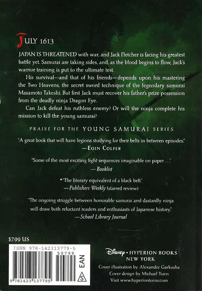 July 1613. Japan is threatened with war and Jack Fletcher is facing his greatest battle yet. Samurai are taking sides and as the blood begins to flow, Jack’s warrior training is put to the ultimate test. His survival - and that of his friends - depends upon him mastering the Two Heavens, the secret sword technique of the legendary samurai Masamoto Takeshi. But first Jack must recover his father’s prize possession from the deadly ninja Dragon Eye. Can Jack defeat his ruthless enemy? Or will the ninja complete his mission to kill the young English samurai?