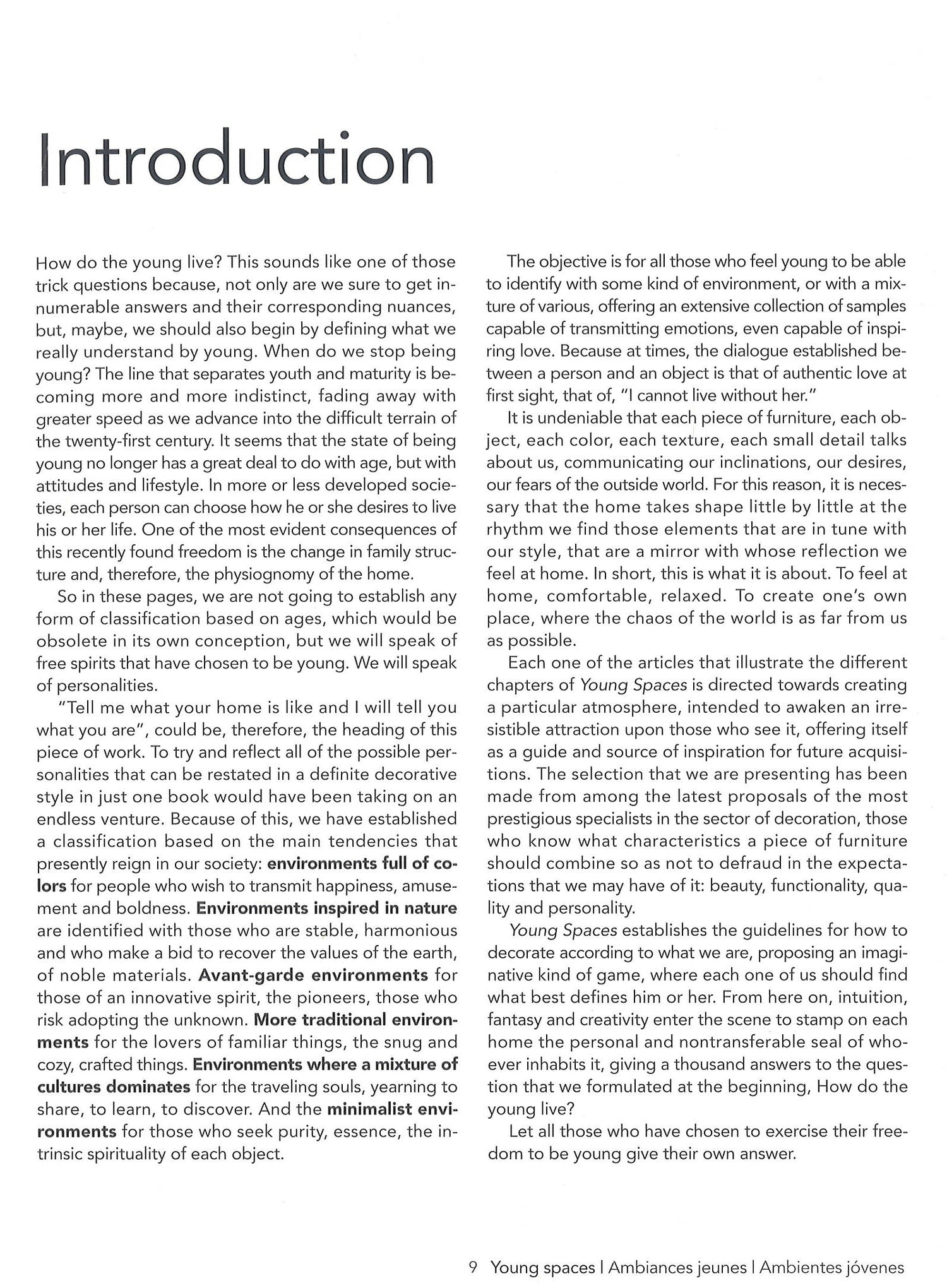 Young spaces establishes the guidelines for how to decorate in function to what we are. It proposes an imaginative form of game in which we should find that which best defines us. The objective is to stamp each home with the personal and nontransferable seal of he or she who inhabits it.