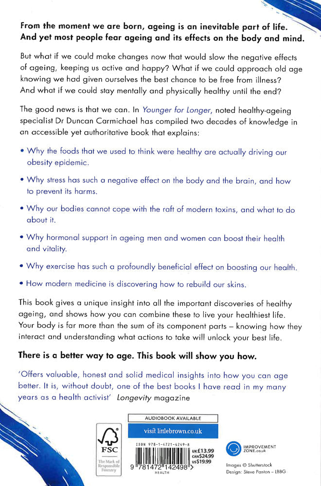 Revelatory and accessible' Sunday Post'[Dr Carmichael] has studied nutrition, hormone balancing and aesthetic medicine, and his passion, on which he lectures globally, is healthy ageing. His approach in his fascinating new book, Younger for Longer, is scientific and holistic' The Times'Be good to yourself . . . [Younger for Longer] features wisdom on nutrition, sleep, mood regulation and, most importantly, hormonal health for men and women' Scotsman'I have not stopped learning on my Low-Carb, Healthy Fat journey. Younger for Longer continues that process for me with an incredibly well-referenced text. It's refreshing to see the balance of nutrition and lifestyle discussed in such an informed and robust manner' Gary Fettke, orthopaedic surgeon, health activist and author'Younger for Longer tells you exactly what you need in order to live an extended, healthy life. It's very 80/20 and one of the best books I've read in ages' Richard Koch, author of million-seller The 80/20 Principle'Fascinating. Packed with the most incredible information about health' Radio Today, South Africa'Offers valuable, honest and solid medical insights into how you can age better. It is, without doubt, one of the best books I have read in my many years as a health activist'Longevity magazineTargeted at the general reader, the goal of this book is to show readers how to live a healthy life free from the debilitating effects of ageing, helping them to stay mentally alert and physically active, and making sure they get the most out of all of their years. It reveals practical steps to slow the ageing process and stay healthy - in short, how to stay younger for longer. With research showing that obesity, nutrition and lifestyle illnesses can hamper our body's response to Covid-19, such advice has become even more crucial in reducing Covid-19 risk factors.The key is to aim for optimal health. However, foucsing on one factor alone will not get us there. Our sleep, our mood, what we eat, our detoxification system and our hormones are just some of the factors that interact in amazing ways to make us who we are; they are also at the very heart of the ageing process.This book shows how these different strands combine in ways that can be positive or negative, and explains why this interaction depends far more on the lifestyle we choose than on the genes we inherit. In that way it gives the reader a unique and comprehensive understanding of their body and tells them how, with this knowledge, they can optimise their health.The topics range from nutrition, toxins, men's health and women's health to understanding why our skin, brain and liver age - and how to undo the damage and stave off ageing. But the book's main focus underlying all of this is hormones: the chemicals that tell different parts of our body what to do. Our hormone levels vary throughout our life, but if they are supported correctly, they can keep us youthful and vital into our final years.Finding health then is not about 'seven ways to detox' or 'the five best vitamins'. The body is far more complex than that and, in an approach aimed specifically at the layperson, Younger for Longer traces the exciting path of how the body works to help the reader create the best person they can be for the rest of their life.