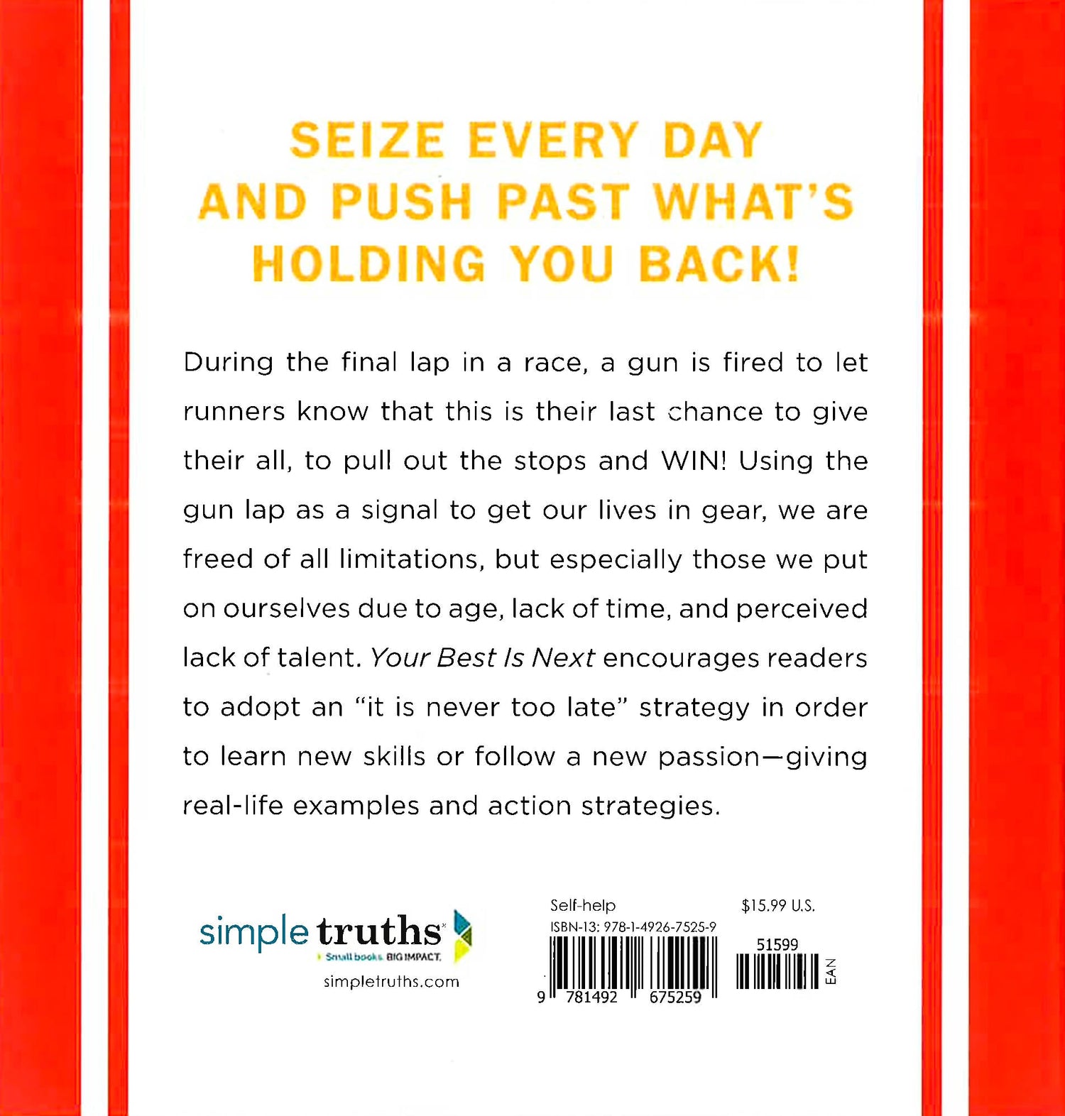 It's never too late to seize every day and break down your limitations!During the final lap in a race, a gun is fired to let racers know that this is their last chance to give the race their all, to pull out all the stops and WIN! Using The Gun Lap as a signal to get our lives in gear, we are freed of all restrictions but especially those we put on ourselves due to age, lack of time, and perceived lack of talent. In the vein of What Color Is Your Parachute? For Retirement and How to Retire Happy, Your Best is Next encourages readers to adopt an "it is never too late" strategy in order to learn new skills or follow a new passion - giving real life examples and action strategies.