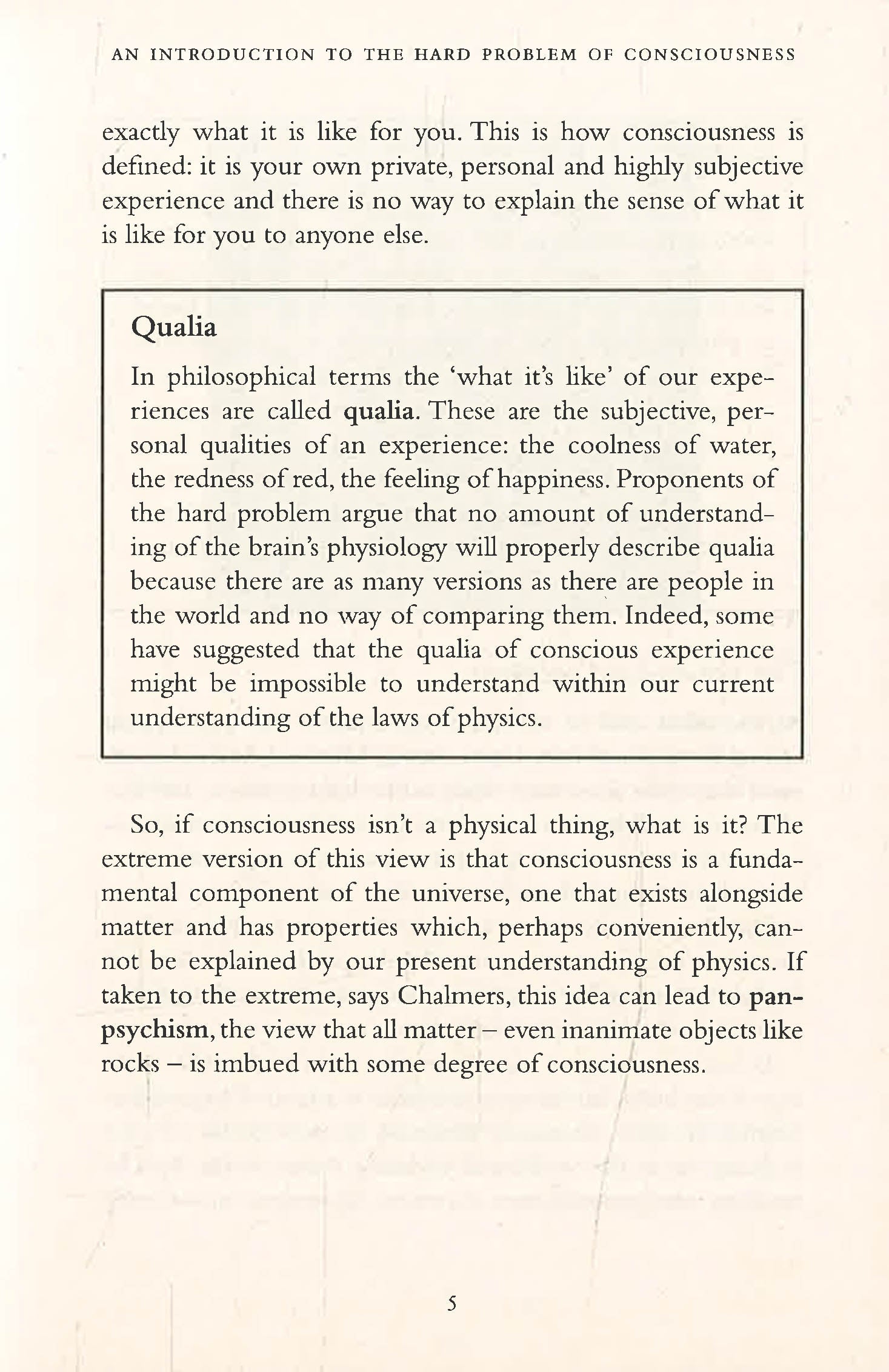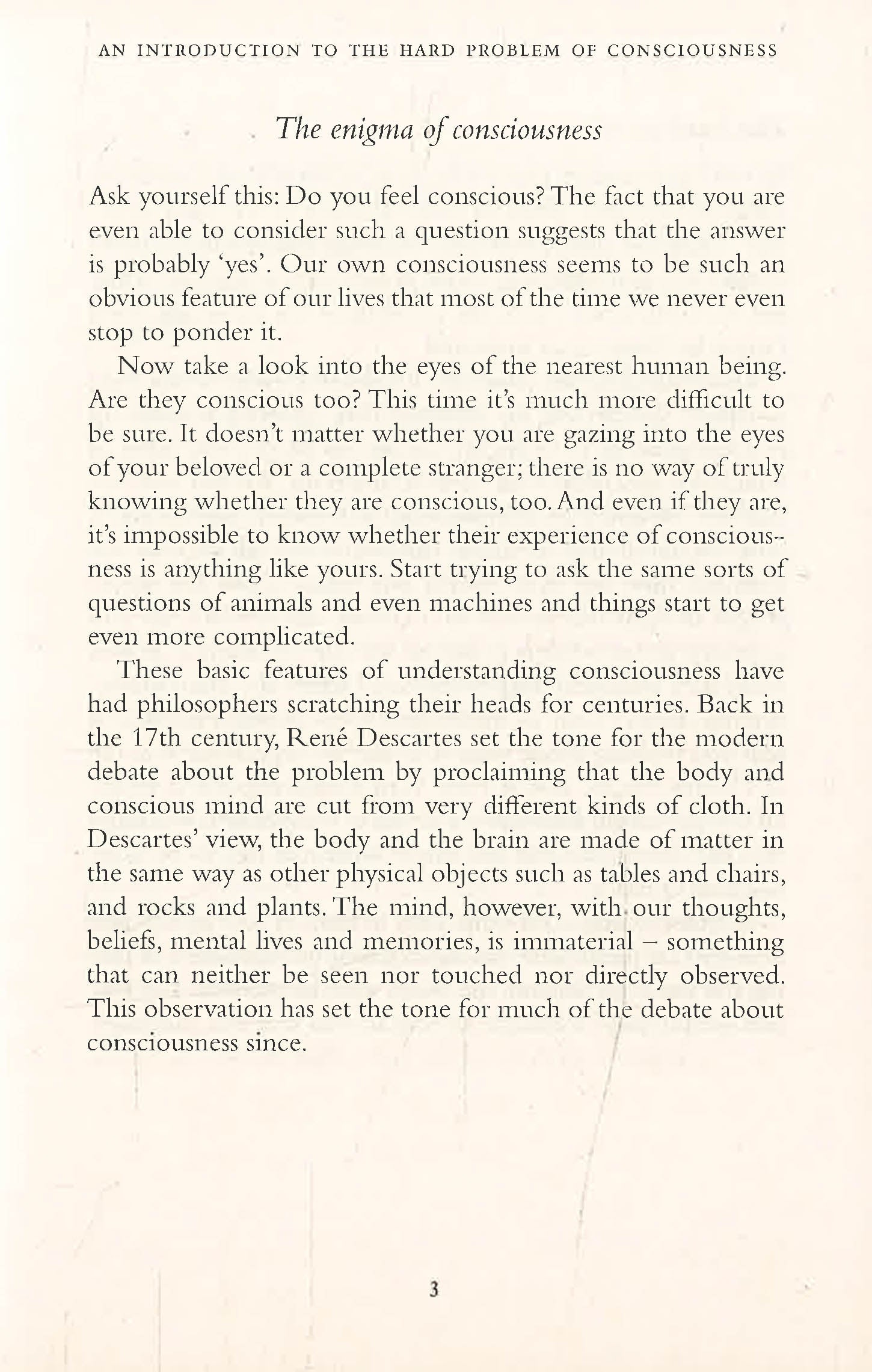 What is this strange mental world that seems so essential to being human? The conscious mind brings together sensations, perceptions, thoughts and memories to generate the seamless movie of a person's life. It makes us aware of the world around us and our own self. How all this emerges from a kilogram of brain cells is one of the greatest unanswered questions.
