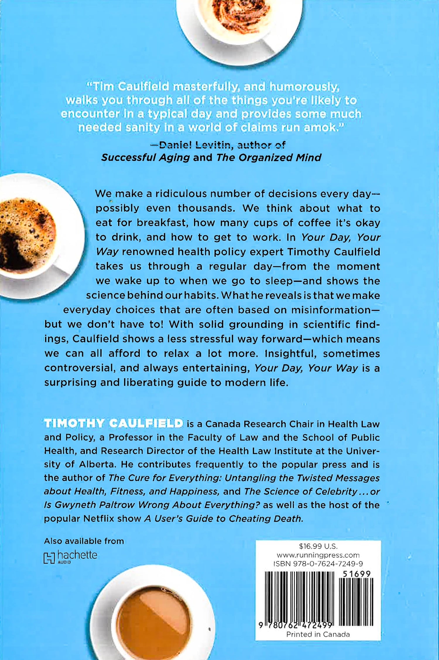 Your Day. Your Way. unfolds like a typical day -- from the first buzz of the alarm clock all the way to bedtime. As the clock moves forward, Caulfield tackles topics associated with that particular time of day and addresses them through science-informed responses about health, offering readers a way to cut through the noise and have healthier and happier lives in the age of anxiety. Caulfield highlights what science says we should be worried about and how we can de-stress and live a healthy lifestyle. Rather than burying you in the facts, or listing out a bunch of specific things you should or should not be doing, Caulfield uses wit, humor, and a wide variety of examples to encourage readers to reevaluate how they make all of those decisions -- so that they can live in a way that truly works for them.
