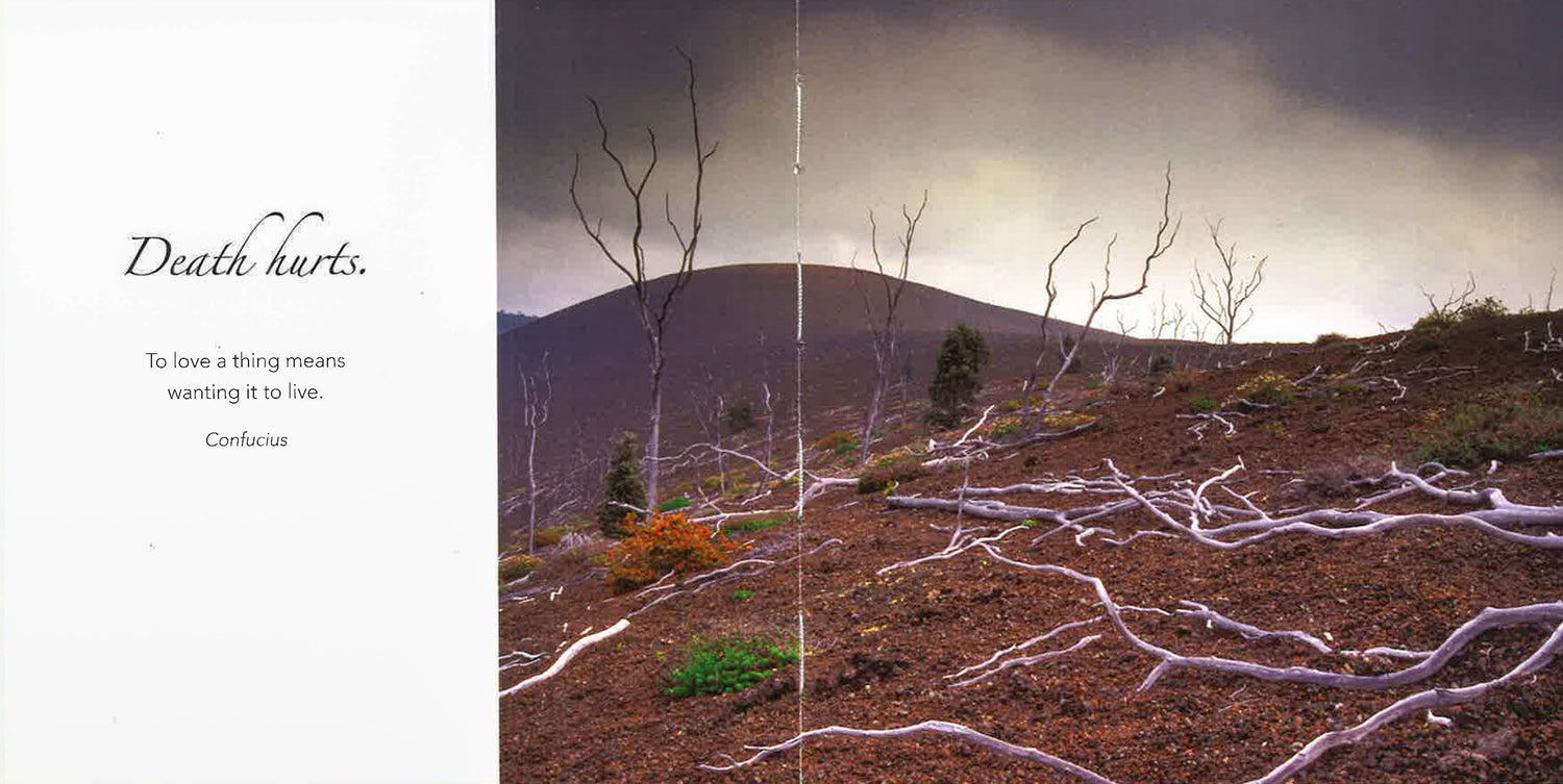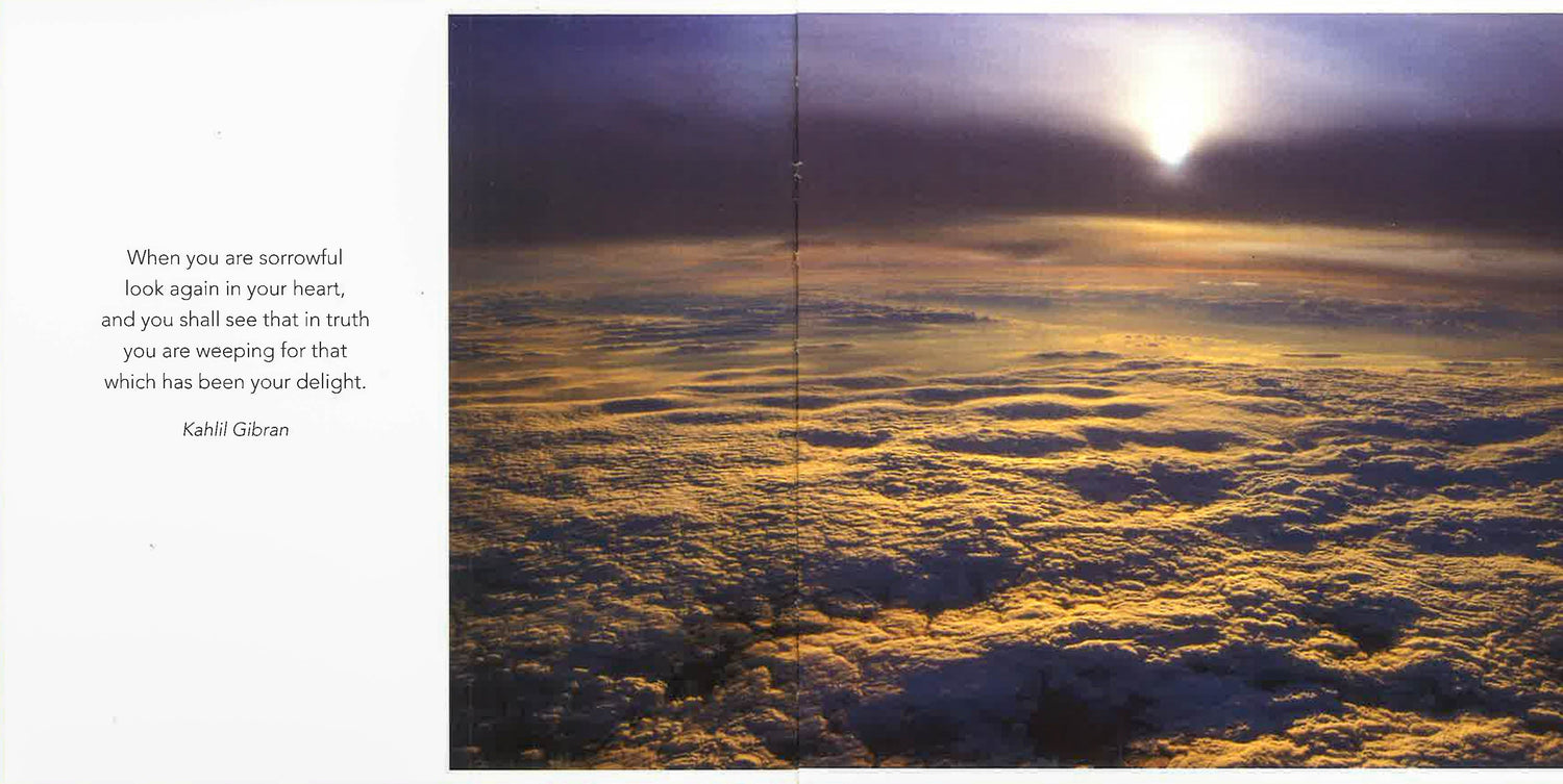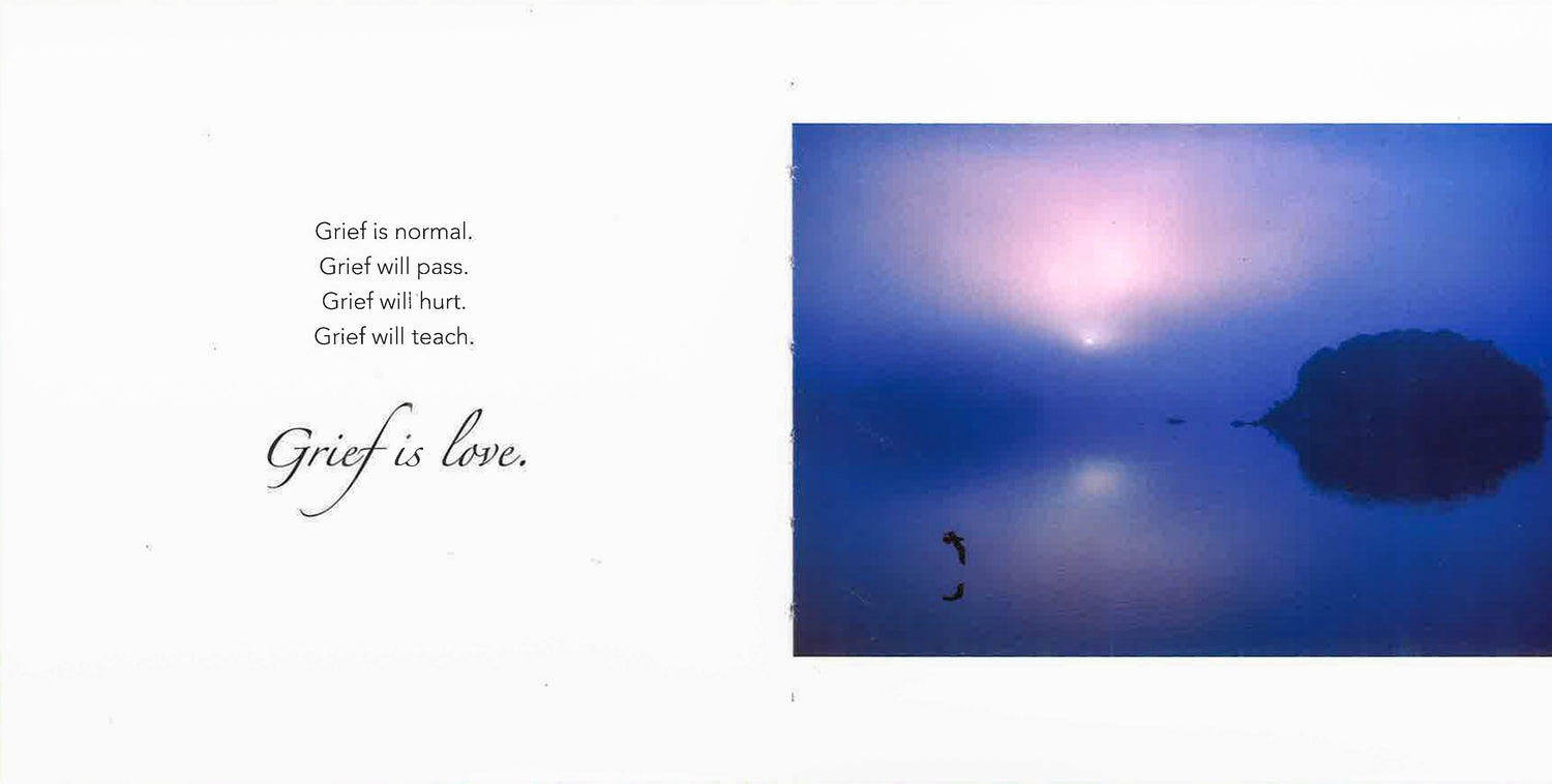 Serenely beautiful color photos on every two-page spread are complemented with words of condolence meant for those who have suffered the loss of a loved one. Many of these statements of sympathy and compassion have been taken from immortal poets and philosophers, including Longfellow, Yeats, Byron, Emerson, and Confucius. One typical heartfelt message states, "When it is dark enough, you can see the stars." The attractive photos present images from nature that capture a mood of peace and tranquility.