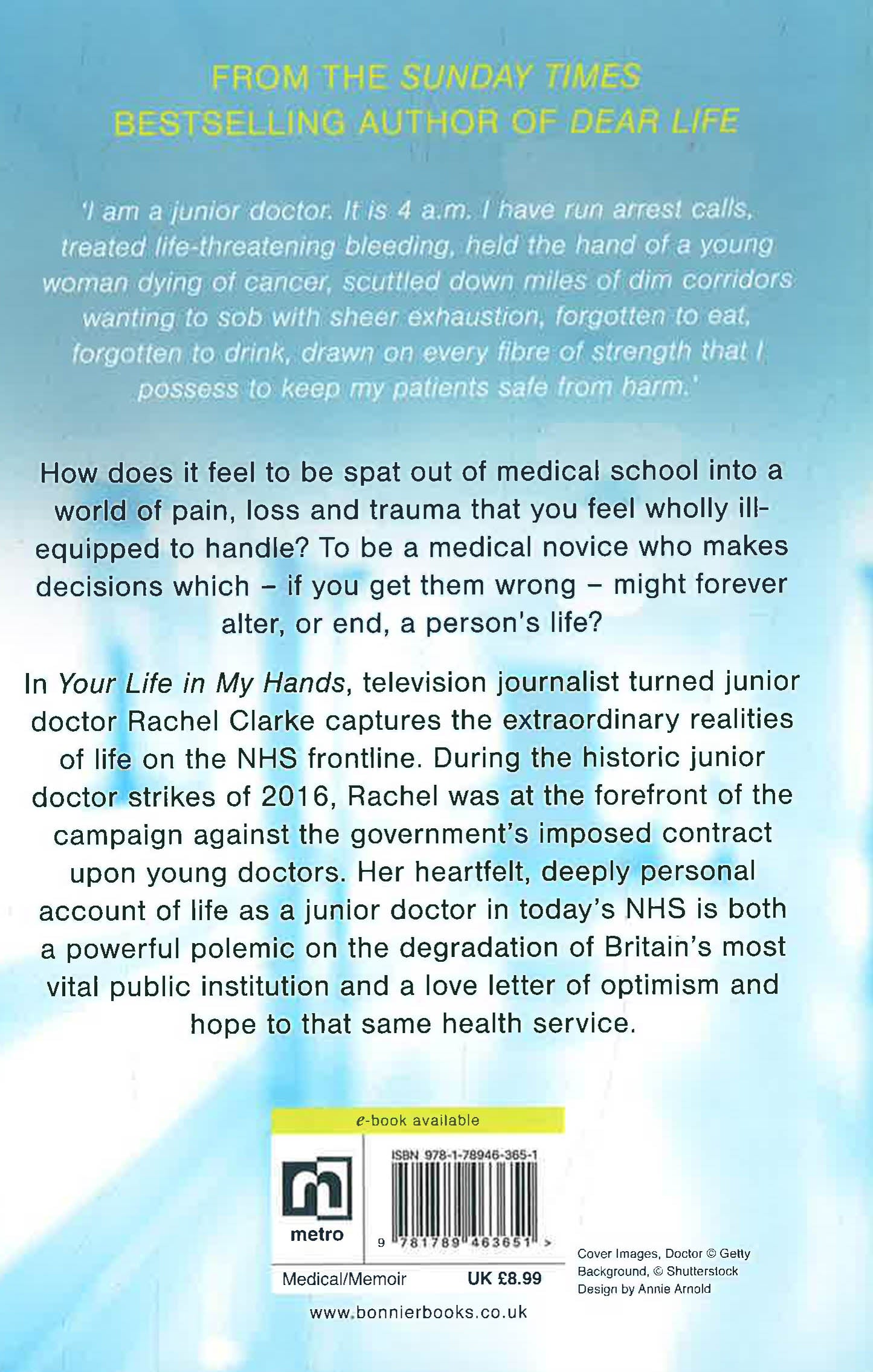 FROM THE SUNDAY TIMES BESTSELLING AUTHOR OF DEAR LIFE 'I am a junior doctor. It is 4 a.m. I have run arrest calls, treated life-threatening bleeding, held the hand of a young woman dying of cancer, scuttled down miles of dim corridors wanting to sob with sheer exhaustion, forgotten to eat, forgotten to drink, drawn on every fibre of strength that I possess to keep my patients safe from harm.' How does it feel to be spat out of medical school into a world of pain, loss and trauma that you feel wholly ill-equipped to handle? To be a medical novice who makes decisions which - if you get them wrong - might forever alter, or end, a person's life? In Your Life in My Hands, television journalist turned junior doctor Rachel Clarke captures the extraordinary realities of life on the NHS frontline. During the historic junior doctor strikes of 2016, Rachel was at the forefront of the campaign against the government's imposed contract upon young doctors. Her heartfelt, deeply personal account of life as a junior doctor in today's NHS is both a powerful polemic on the degradation of Britain's most vital public institution and a love letter of optimism and hope to that same health service.