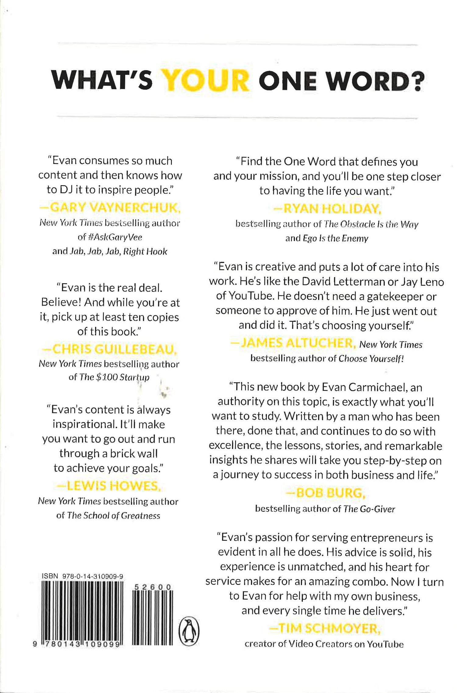 --Gary Vaynerchuk, New York Times bestselling author of #AskGaryVee and Jab, Jab, Jab, Right Hook In this bold and empowering guide, entrepreneur and social media sensation Evan Carmichael shares the secret to turbo-charging your path to success on your own terms. With thought-provoking questions and inspiring, instructive examples, Your One Word will help you nail down your personal mottos - the word that captures your purpose and passion. With this operating philosophy in hand, you will then learn how to leverage this powerful tool to create the business and future of your dreams. Aimed at entrepreneurs as well as intrapreneurs, managers, and anyone else who wants to achieve success in a powerfully meaningful way, Your One Word more than just a useful tool. It's also an inspiring and enlightening read.