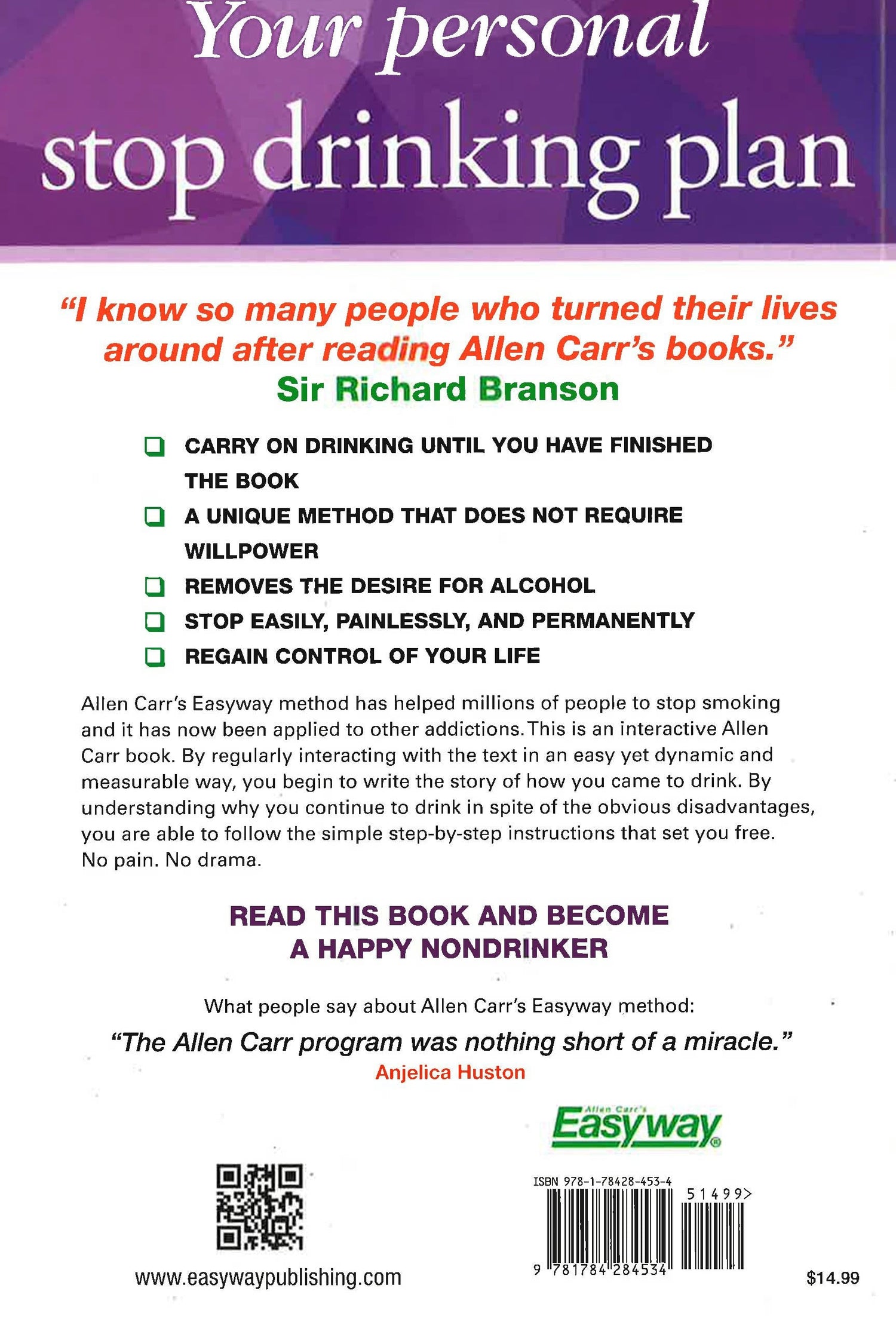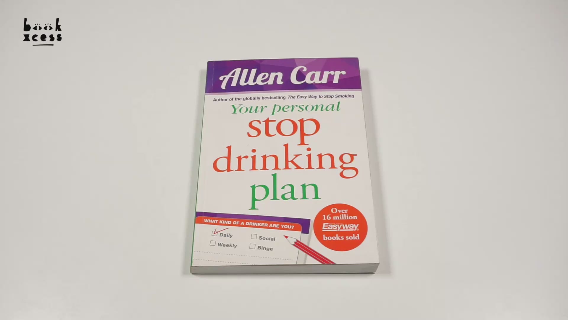 READ THIS BOOK AND BECOME A HAPPY NONDRINKER. Allen Carr's Easyway method has helped millions of people to stop smoking and it has now been applied to other addictions. This is an interactive Allen Carr book. By regularly interacting with the text in an easy yet dynamic and measurable way, you begin to write the story of how you came to drink. By understanding why you continue to drink in spite of the obvious disadvantages, you are able to follow the simple step-by-step instructions that set you free. No pain. No drama. - CARRY ON DRINKING UNTIL YOU HAVE FINISHED THE BOOK- A UNIQUE METHOD THAT DOES NOT REQUIRE WILLPOWER- REMOVES THE DESIRE FOR ALCOHOL- REGAIN CONTROL OF YOUR LIFE