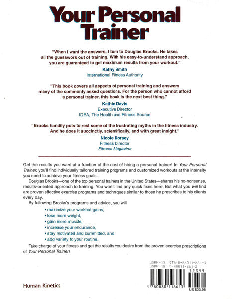 Are you struggling to develop an exercise program? Having trouble sticking with your current program? Dissatisfied with the results you're seeing-or not seeing? Your Personal Trainer gives you customized, expert training advice that will help you get the results you want. And it does so at a fraction of the cost of hiring your own trainer!Douglas Brooks-one of the top personal trainers in the United States-shares his no-nonsense, results-oriented approach to training. He offers no quick fixes, but what he does offer are proven effective exercise programs and techniques similar to those he prescribes to his clients every day.Your Personal Trainer provides individually tailored programs, structured workouts, and planned training cycles, all featuring the latest exercise information available to help you achieve your fitness goals. Here's just a sampling of the many features you'll find:- Guidelines for scheduling your workouts- Recommended stretches and strength exercises- Interval training models- Warm-up and cool-down techniques- Advice on cross-training- Nutrition tips- Hints for building in rest and recovery- Self-tests for tracking your progressThrough it all, Brooks will keep you motivated and make your exercise program fun, not drudgery. Regardless of your fitness level, the time-tested techniques in Your Personal Trainer will give you a training advantage and empower you to take control of your fitness and health.If you're a personal trainer, you too can use Your Personal Trainer to better serve your clients. You'll find state-of-the-art advice on how to build a training regimen around your clients' specific needs, limitations, and goals. Plus, you'll learn Brooks' techniques for motivating clients.