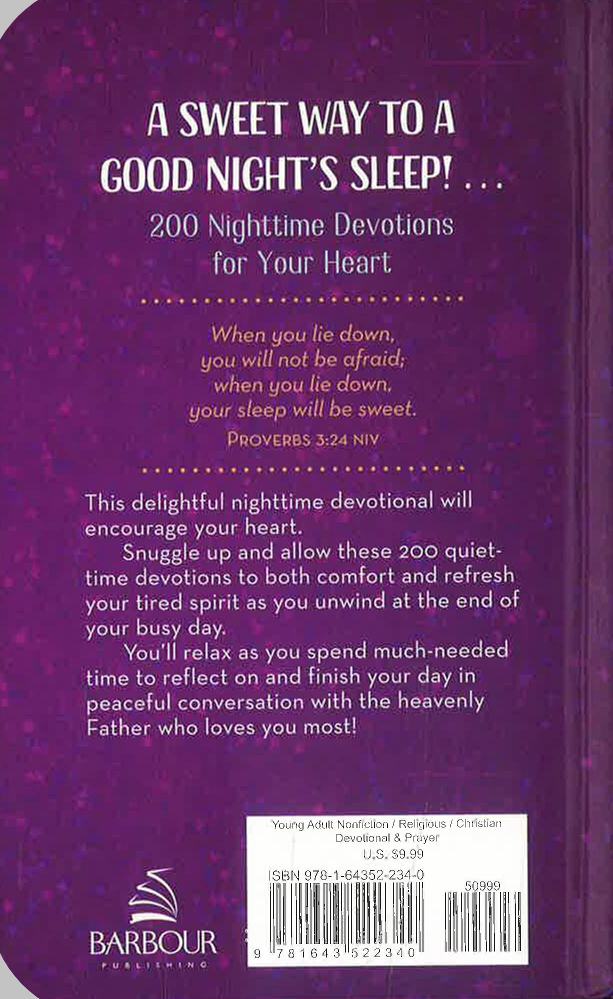 Inspired by Proverbs 3:24 (NIV): "When you lie down, you will not be afraid; when you lie down, your sleep will be sweet," this delightful nighttime devotional will encourage your heart. Two hundred devotions will comfort and refresh your tired spirit as you unwind at the end of your busy day. You'll relax as you spend much-needed quiet time. . .to reflect on and end your day in peaceful conversation with the heavenly Father.