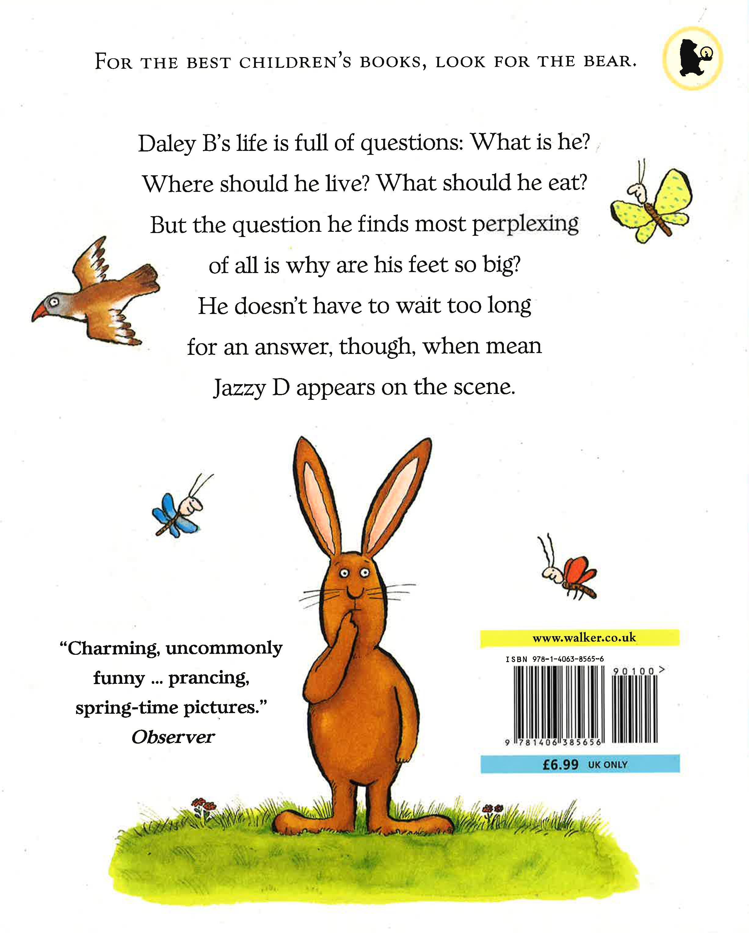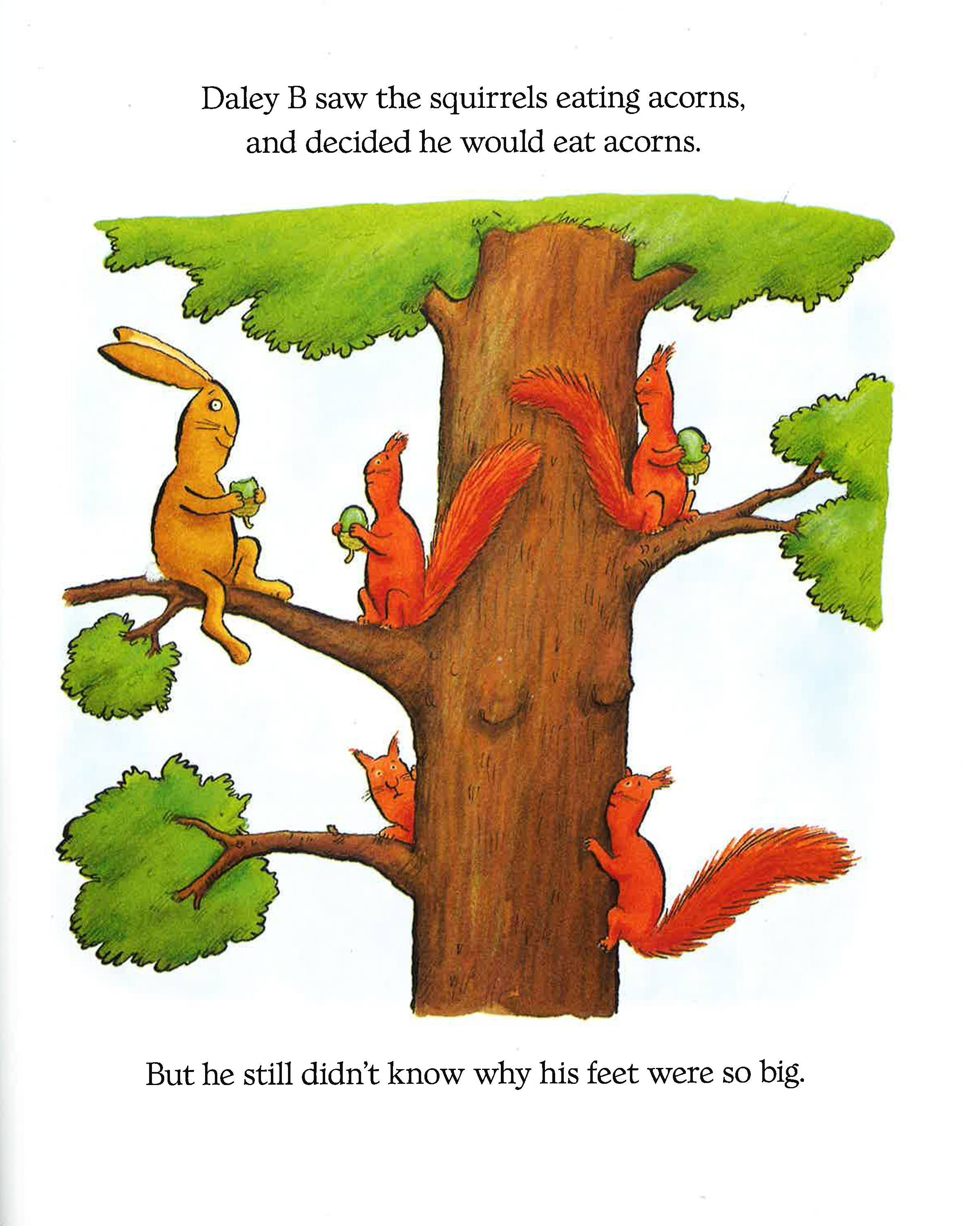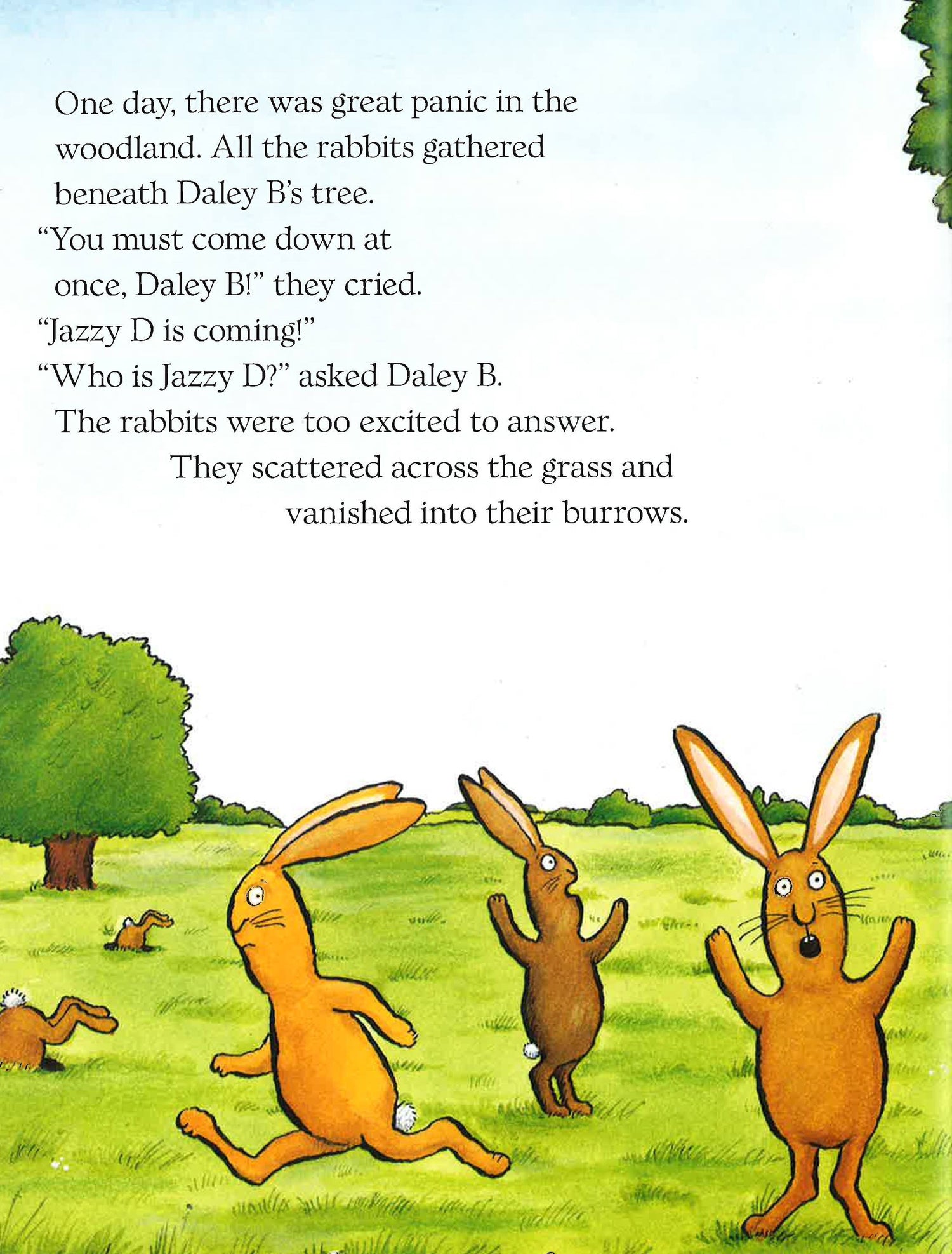 Daley B is full of questions. He doesn't know what sort of animal he is, where he should live, what he should eat or why he has such big feet. He decides to live in a tree and eat acorns, but he still doesn't know why his feet are so big. Then, one day, there is panic in the woodland. The wicked weasel Jazzy D is on her way - and she eats rabbits! But Daley B is unperturbed - and when Jazzy D attacks, he finally finds a use for his big feet and kicks her. He also finds out what he is - a hero!