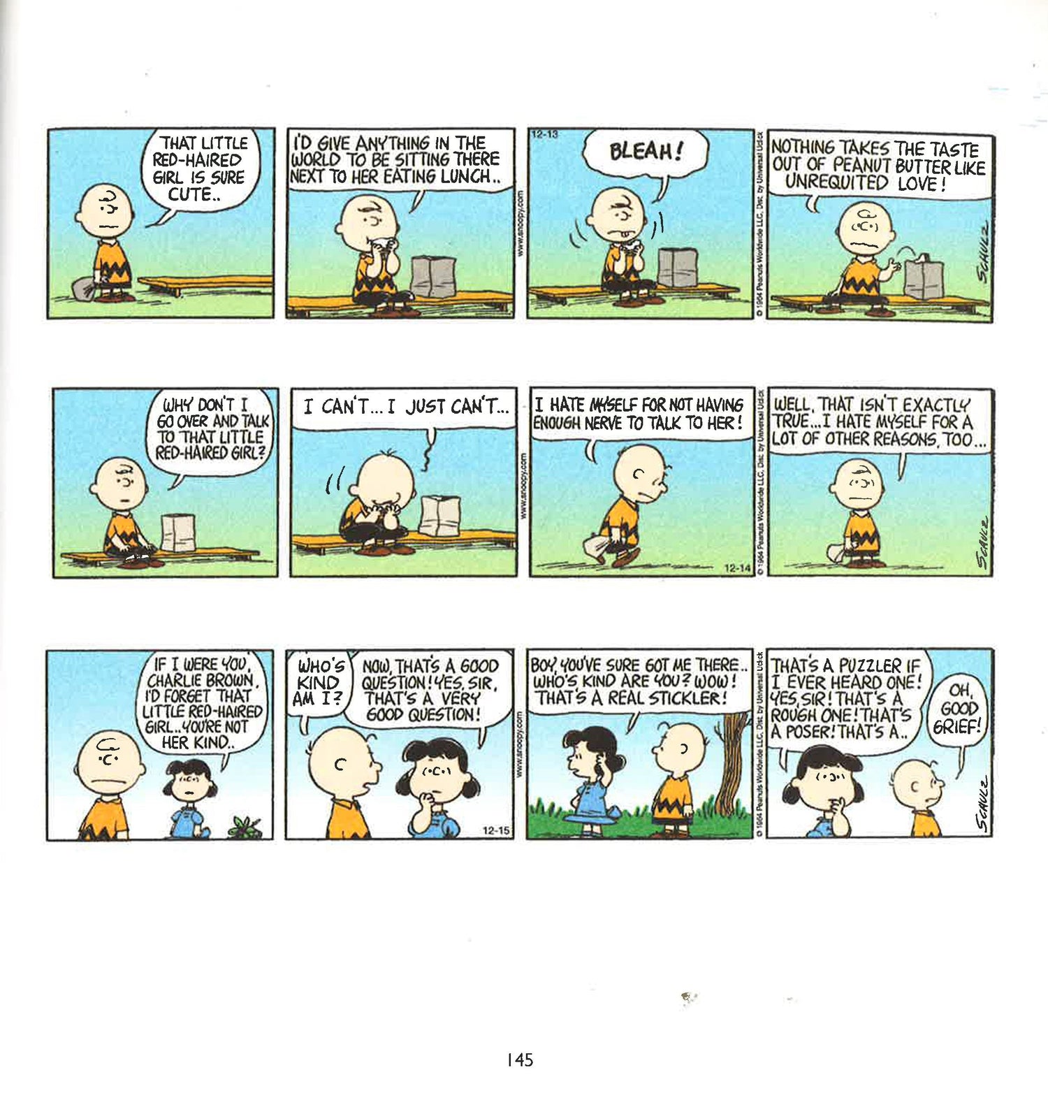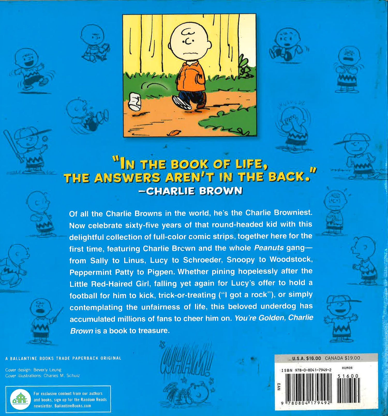 In the book of life, the answers aren t in the back. Charlie Brown Of all the Charlie Browns in the world, he s the Charlie Browniest. Now celebrate sixty-five years of that round-headed kid with this delightful collection of full-color comic strips, together here for the first time, featuring Charlie Brown and the whole "Peanuts" gang from Sally to Linus, Lucy to Schroeder, Snoopy to Woodstock, Peppermint Patty to Pigpen. Whether pining hopelessly after the Little Red-Haired Girl, falling yet again for Lucy s offer to hold a football for him to kick, trick-or-treating ( I got a rock ), or simply contemplating the unfairness of life, this beloved underdog has accumulated millions of fans to cheer him on. Y"ou re Golden, Charlie Brown" is a book to treasure. *This book may have remainder mark*