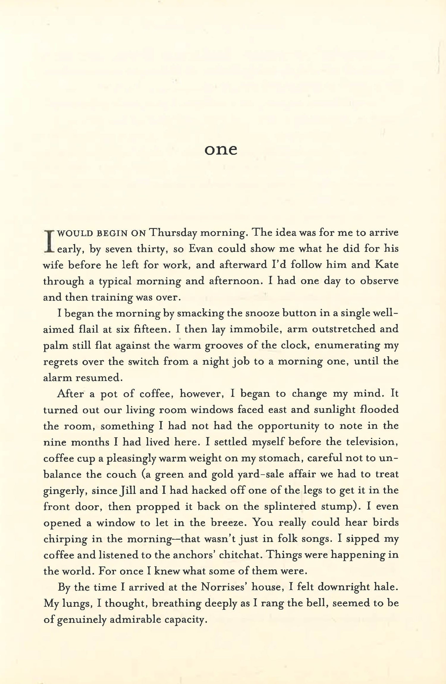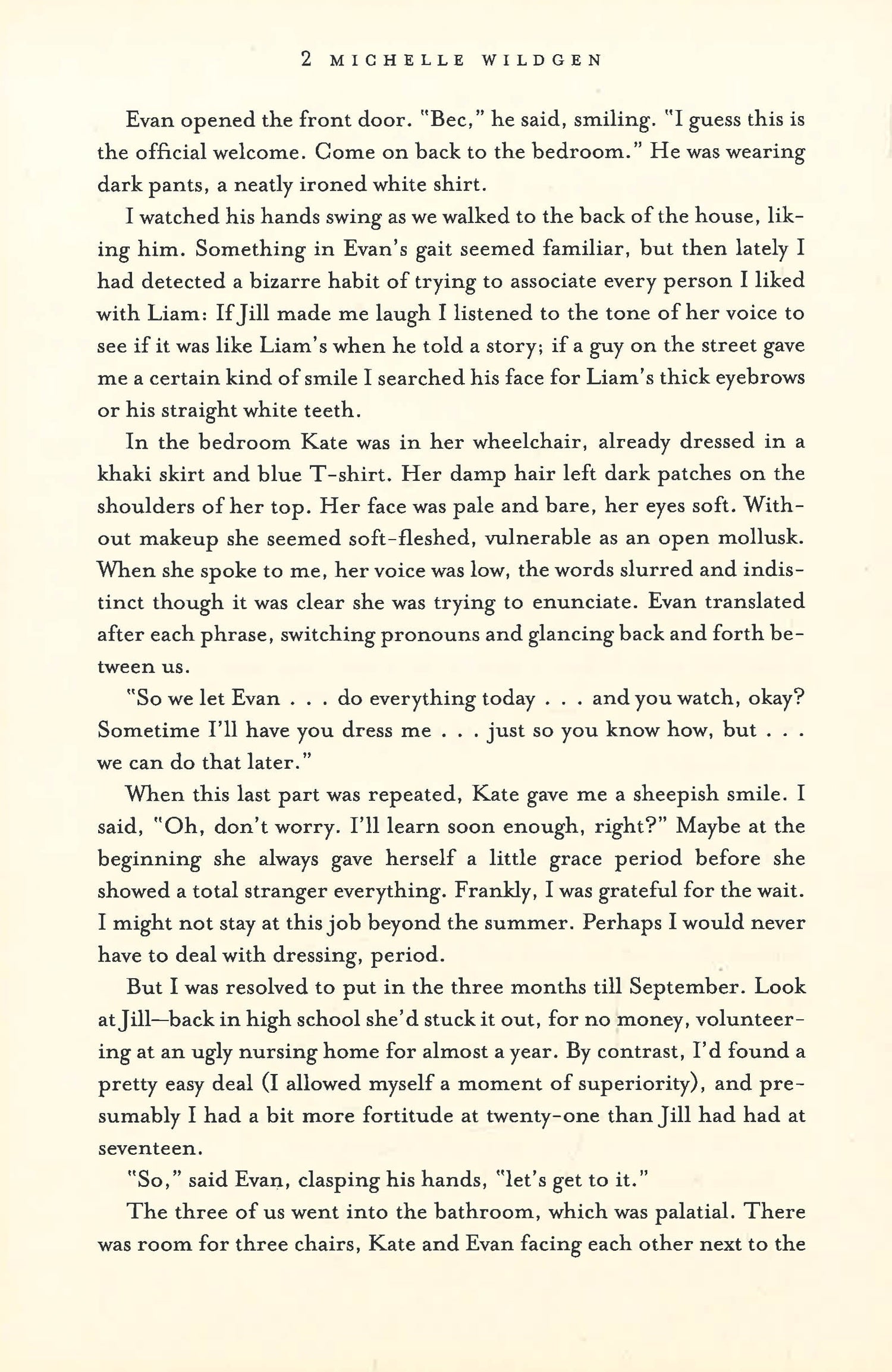 Bec is adrift. It's the summer before her junior year in college. She's sleeping with a married professor, losing interest in her classes, and equivocating about her career. She takes a job caring for Kate, a thirty-six-year-old woman who has been immobilized by ALS.