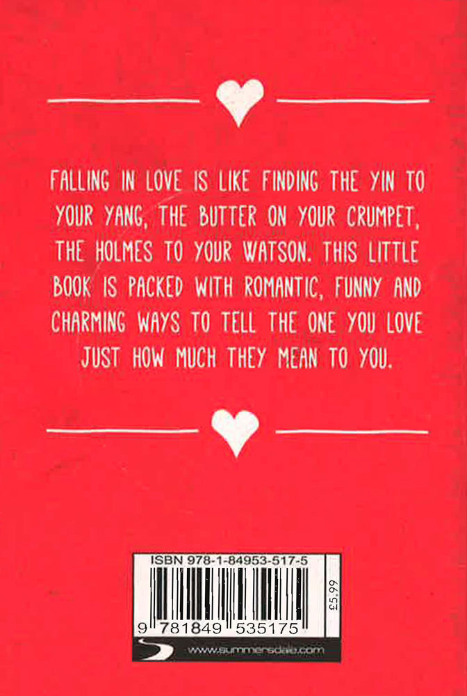Falling in love is like finding the yin to your yang, the butter on your crumpet, the Watson to your Holmes. This little book is packed with romantic, funny and charming ways to tell the one you love just how much they mean to you.Falling in love is like finding the yin to your yang, the butter on your crumpet, the Watson to your Holmes. This little book is packed with romantic, funny and charming ways to tell the one you love just how much they mean to you.