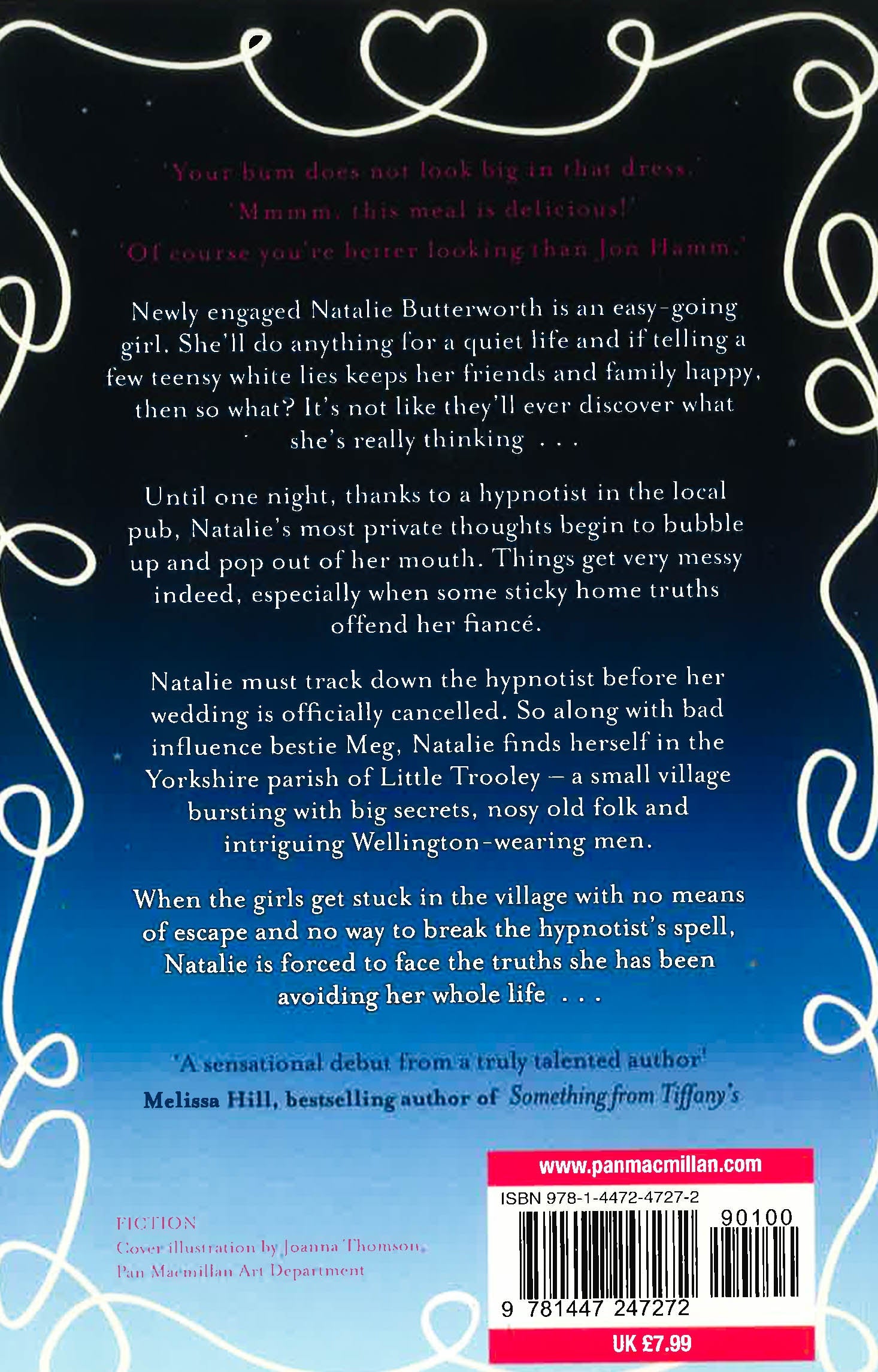 Your bum does not look big in that dress. Mmmm, this meal is delicious! Of course you're better looking than Jon Hamm." Newly engaged Natalie Butterworth is an easy-going girl. She'll do anything for a quiet life and if telling a few teensy white lies keeps her friends and family happy, then so what? It's not like they'll ever discover what she's really thinking ...Until one night, thanks to a pub hypnotist, Natalie's most private thoughts begin to bubble up and pop out of her mouth. Things get very messy indeed, especially when some sticky home truths offend her fiance. Natalie must track down the hypnotist before her wedding is officially cancelled. So along with bad influence bestie Meg, Natalie finds herself in the Yorkshire Parish of Little Trooley - a small village bursting with big secrets, nosy old folk and intriguing Wellington-wearing men. When the girls get stuck in the village with no means of escape and no way to break the hypnotist's spell, Natalie is forced to face the truths she has been avoiding her whole life...