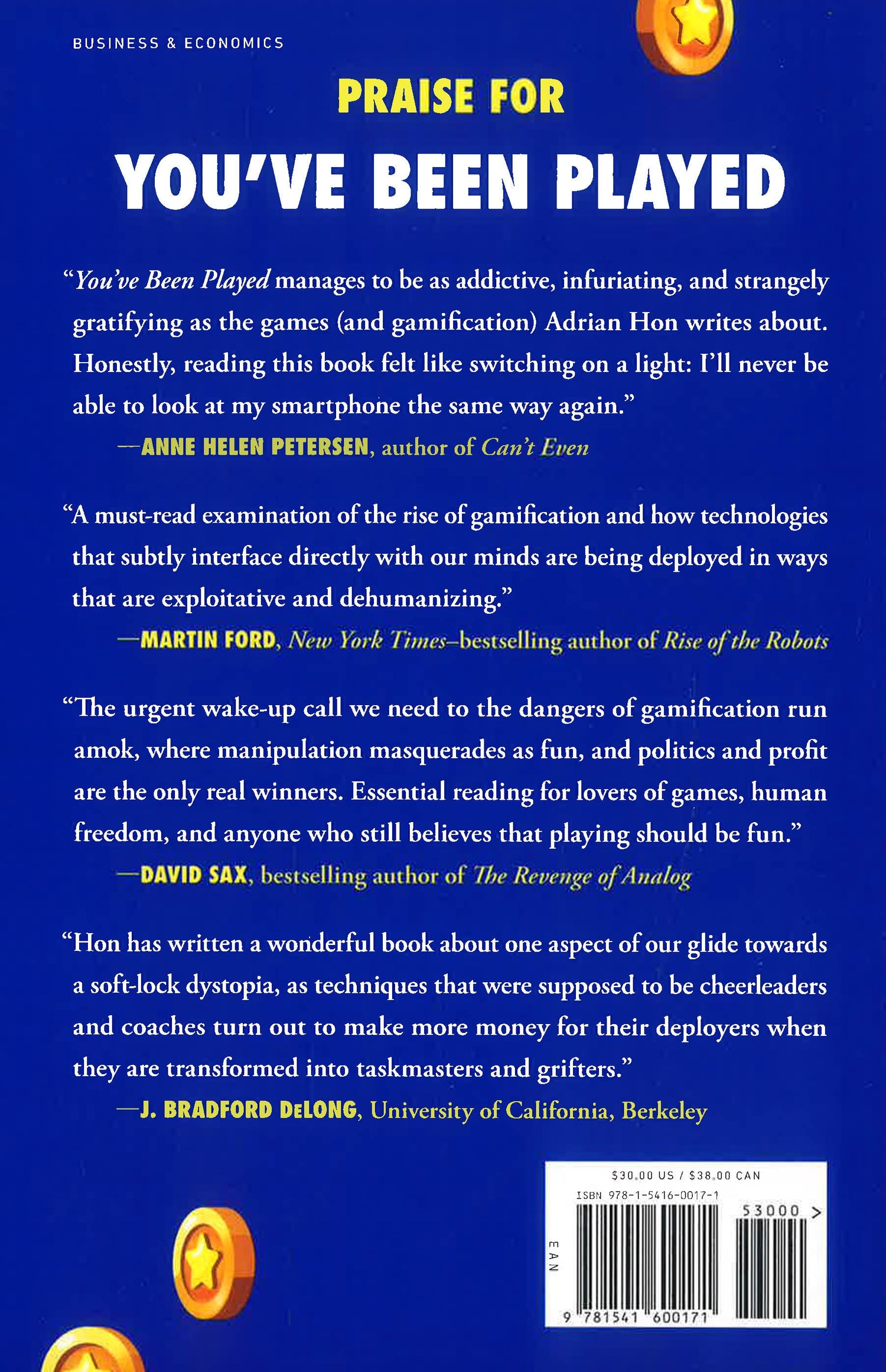 Points, badges, and leaderboards are creeping into every aspect of modern life. In You've Been Played, game designer Adrian Hon delivers a blistering takedown of how corporations, schools, and governments use games and gamification as tools for profit and coercion. These are games that we often have no choice but to play, where losing has heavy penalties. You've Been Played is a scathing indictment of a tech-driven world that wants to convince us that misery is fun, and a call to arms for anyone who hopes to preserve their dignity and autonomy.