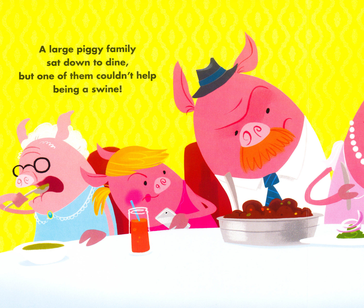 When a large piggy family sat down to dine, one of them couldn't help being a swine!