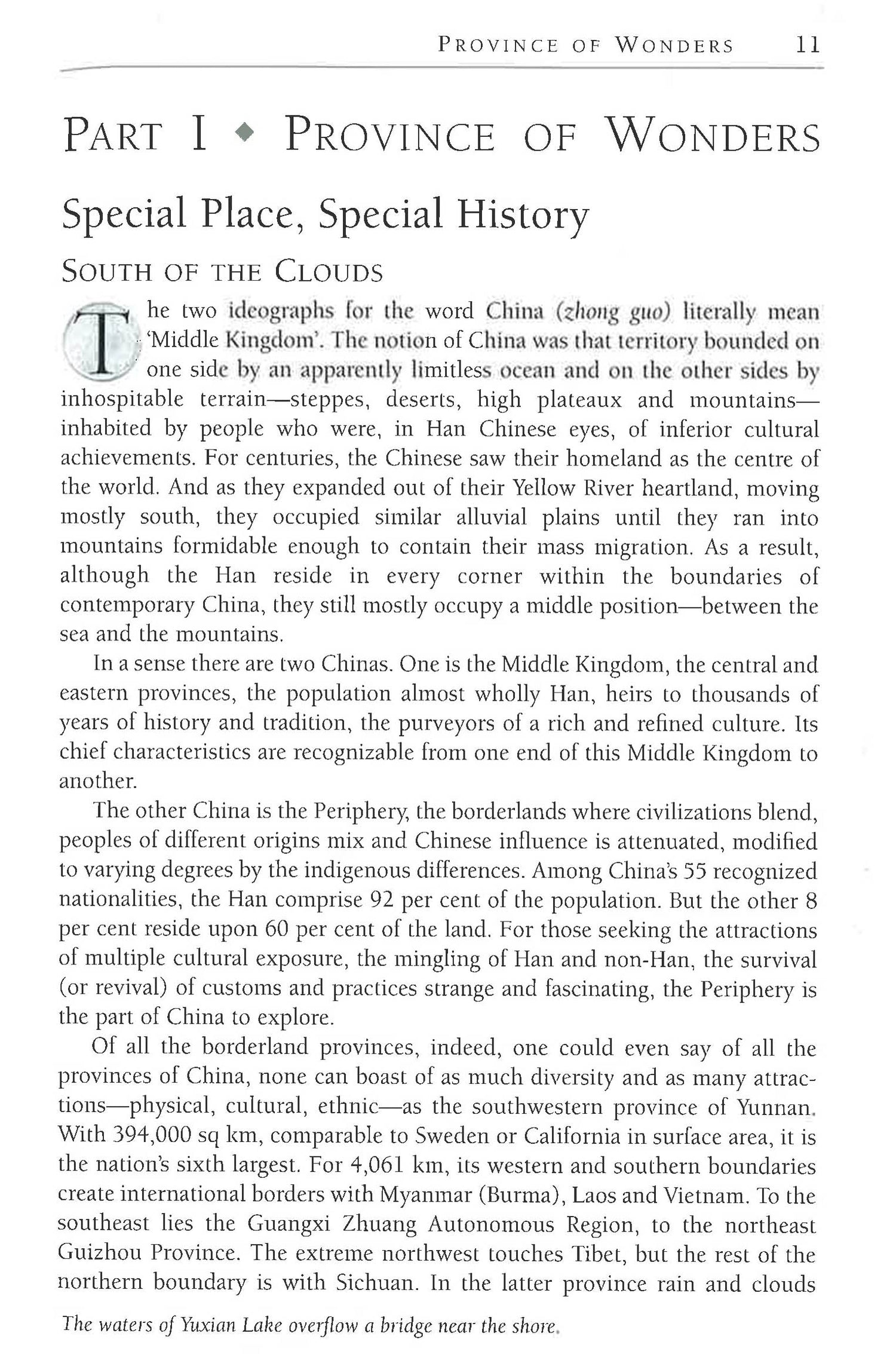 Wedged between Tibet and the exotic lands of Southeast Asia, Yunnan Province is one of the least known and most beguiling regions of China. A mountainous wonderland, it is home to 24 diverse, colourful ethnic cultures. With a name meaning 'South of the Clouds', Yunnan boasts sparkling blue skies, red earth and green forests. The picturesque capital of Yunnan, Kunming - 'the City of Eternal Spring' - lies near a serene, mile-high lake. Other natural marvels, such as the haunting Stone Forest and lush, tropical Xishuangbanna, make Yunnan a microcosm of China at its very best.It covers the historical cities of Lijiang and Zhongdian. It describes astonishing Bronze Age culture. It covers the botanical wonderland; adventure travels; and World Heritage sites, including the 'Three Great Rivers' and the holy mountain Kawakarpo. It covers the largest concentration of minority nationalities in China. It describes the art, handicrafts and textiles. It covers the unique food and drink of Yunnan.