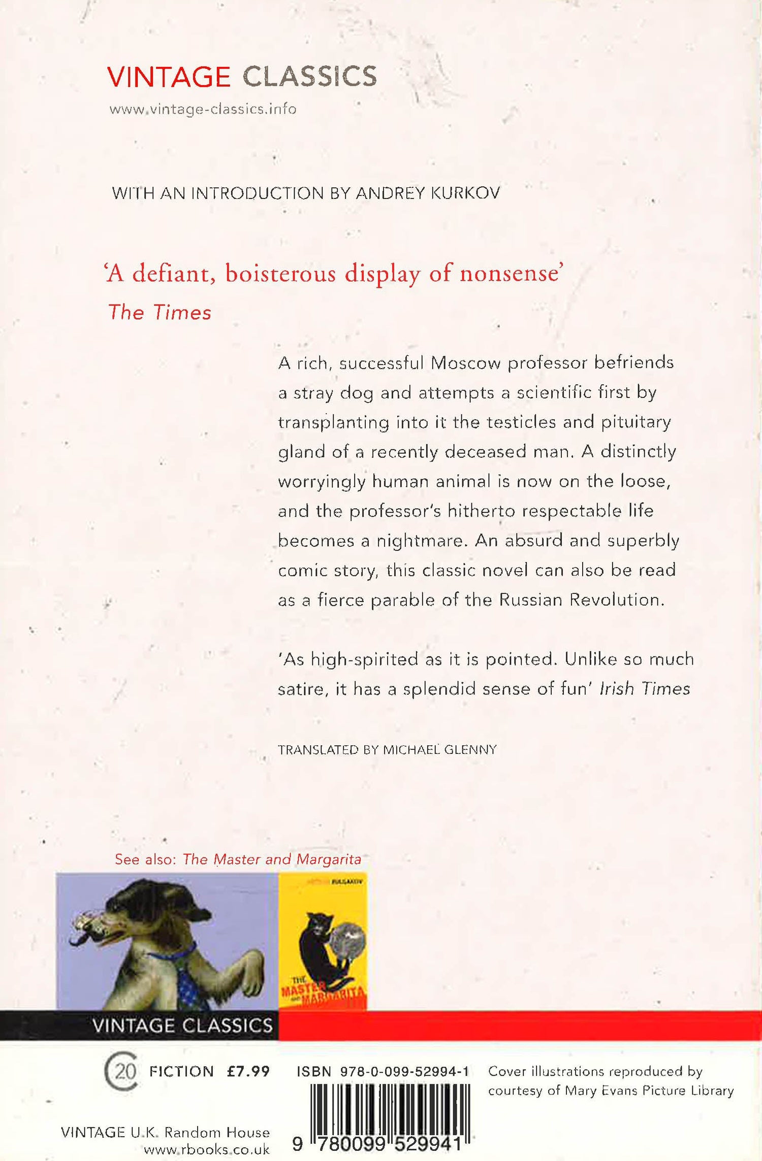 A rich, successful Moscow professor befriends a stray dog and attempts a scientific first by transplanting into it the testicles and pituitary gland of a recently deceased man. A distinctly worryingly human animal is now on the loose, and the professor's hitherto respectable life becomes a nightmare beyond endurance. An absurd and superbly comic story, this classic novel can also be read as a fierce parable of the Russian Revolution.