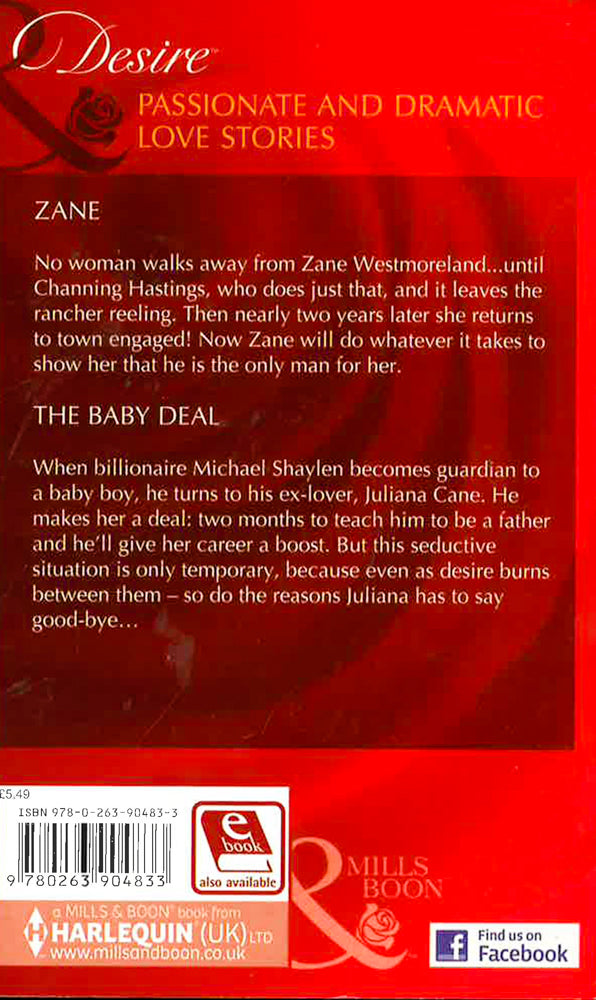 Zane No woman walks away from Zane Westmoreland...until Channing Hastings, who does just that, and it leaves the rancher reeling. Then nearly two years later she returns to town engaged! Now Zane will do whatever it takes to show her that he is the only man for her. The Baby Deal When billionaire Michael Shaylen becomes guardian to a baby boy, he turns to his ex-lover, Juliana Cane. He makes her a deal: two months to teach him to be a father and he'll give her career a boost. But this seductive situation is only temporary, because even as desire burns between them - so do the reasons Juliana has to say good-bye...