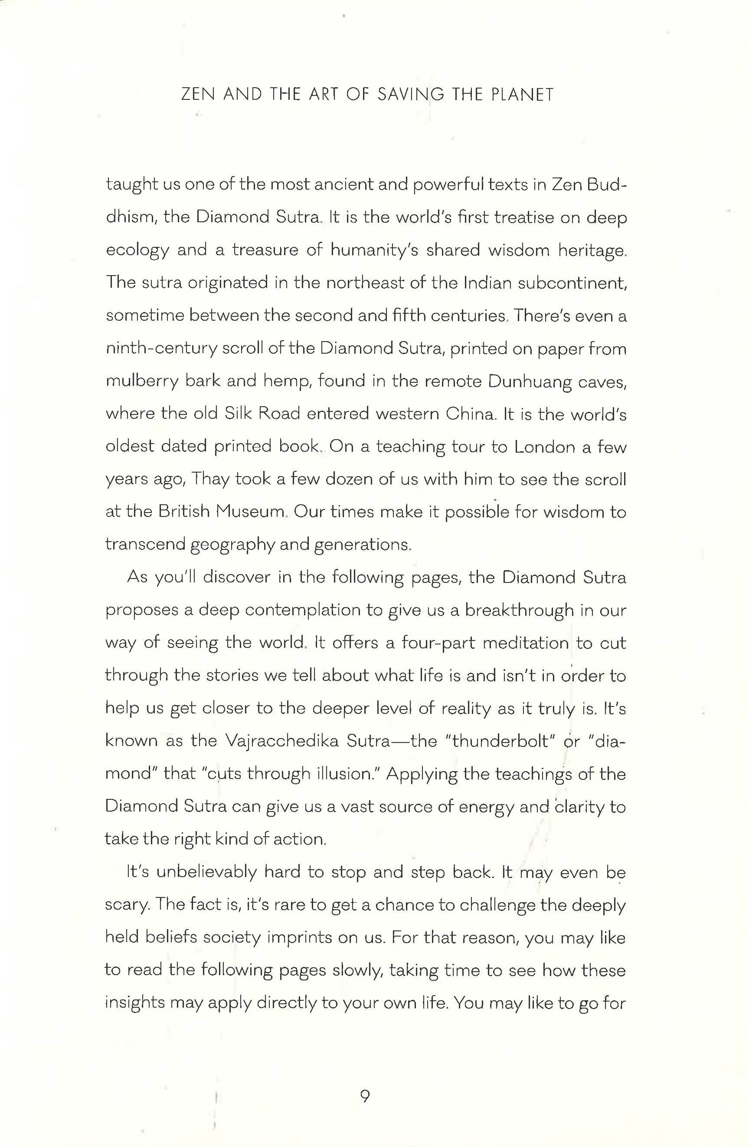“When you wake up and you see that the Earth is not just the environment, the Earth is us, you touch the nature of interbeing. And at that moment you can have real communication with the Earth… We have to wake up together. And if we wake up together, then we have a chance. Our way of living our life and planning our future has led us into this situation. And now we need to look deeply to find a way out, not only as individuals, but as a collective, a species.”