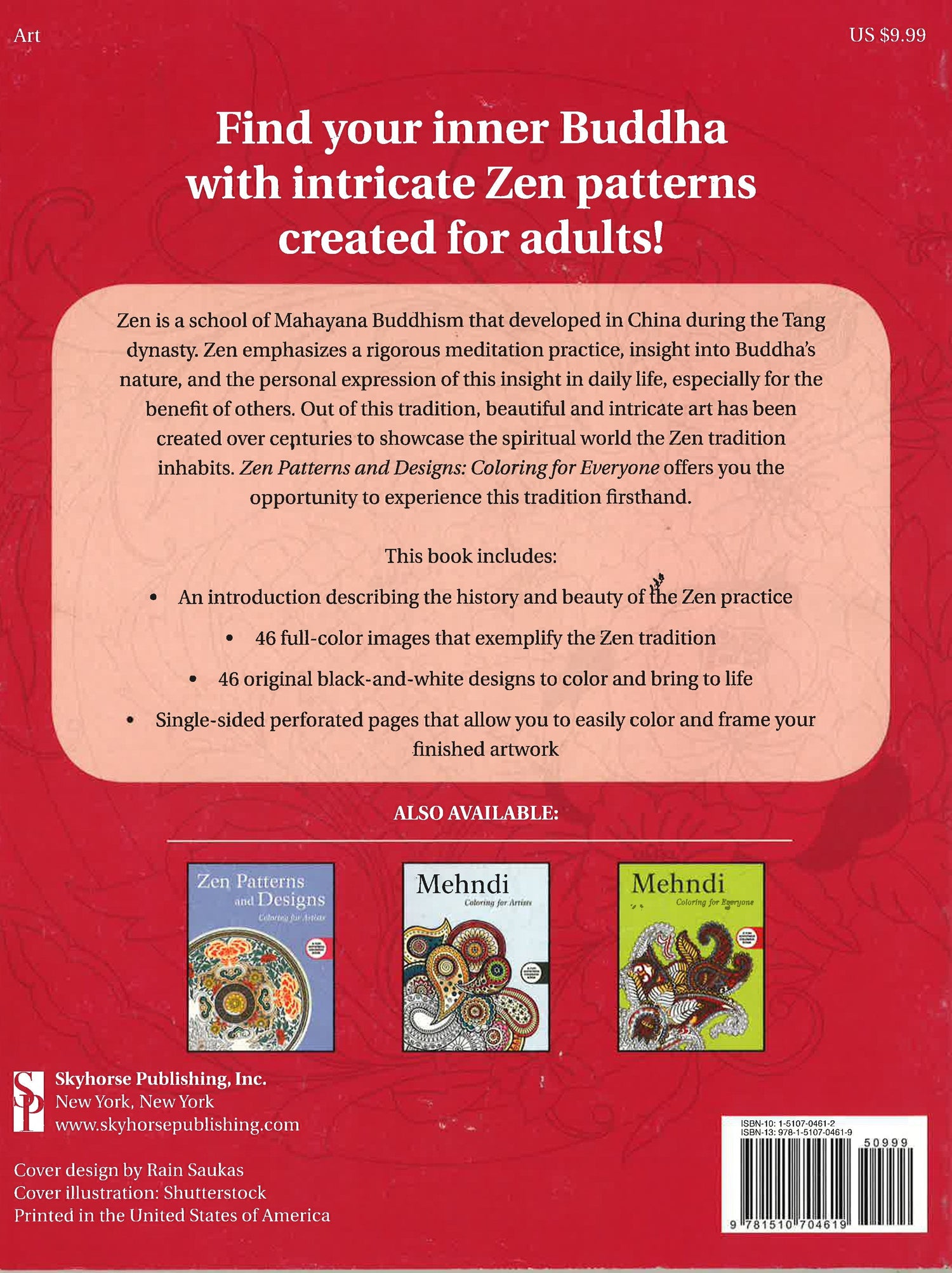 Zen is a school of Mahayana Buddhism that developed in China during the Tang dynasty. Zen emphasizes a rigorous meditation practice, insight into Buddha's nature, and the personal expression of this insight in daily life, especially for the benefit of others. Out of this tradition, beautiful and intricate art has been created over centuries to showcase the spiritual world the Zen tradition inhabits. Zen Patterns and Designs: Coloring for Artists offers forty-six fully colored Zen designs that will inspire you as you color the forty-six black-and-white templates that are perforated so that each one can be removed to be displayed. The designs have been created specifically for you. Enhanced with intricate, unique patterns and step-by-step instructions on how to best color and create beautiful work, this book has a little bit of something for everyone. So explore your creative side, and discover the relaxing benefits of coloring Zen art. In summary, this vibrant compilation: Begins with an introduction describing the history and beauty of the Zen practice Features forty-six original black-and-white designs for readers to color on single-sided perforated pages, allowing them to remove and frame their artwork Includes forty-six full-color images that exemplify the Zen tradition