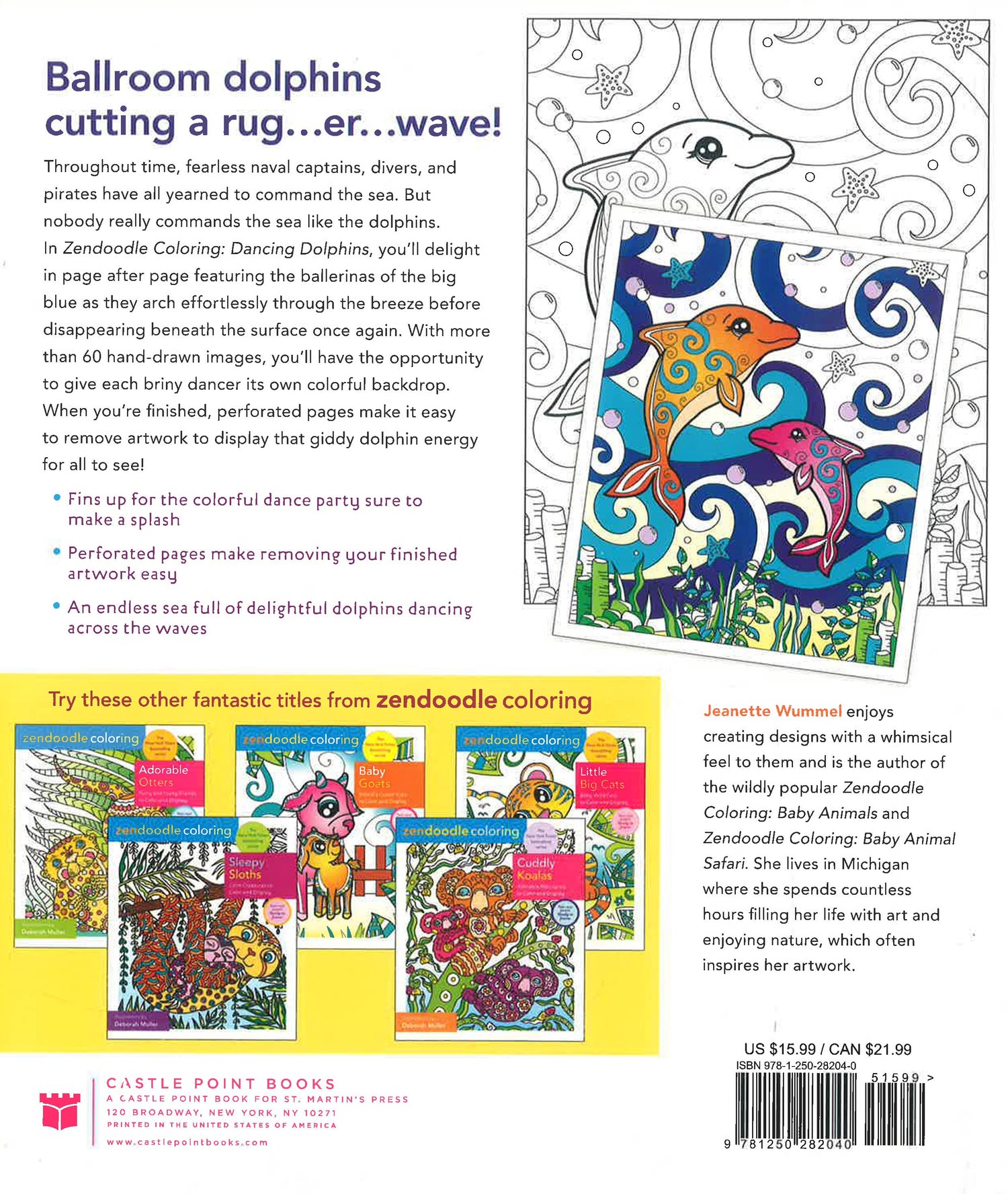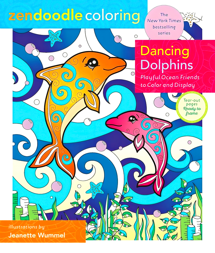 Throughout time, fearless naval captains, divers, and pirates have all yearned to command the sea. But nobody really commands the sea like the dolphins. In Jeanette Wummel's Zendoodle Coloring: Dancing Dolphins, you’ll delight in page after page featuring the ballerinas of the big blue as they arch effortlessly through the breeze before disappearing beneath the surface once again. With more than 60 hand-drawn images, you’ll have the opportunity to give each briny dancer its own colorful backdrop. When you’re finished, perforated pages make it easy to remove artwork to display that giddy dolphin energy for all to see!