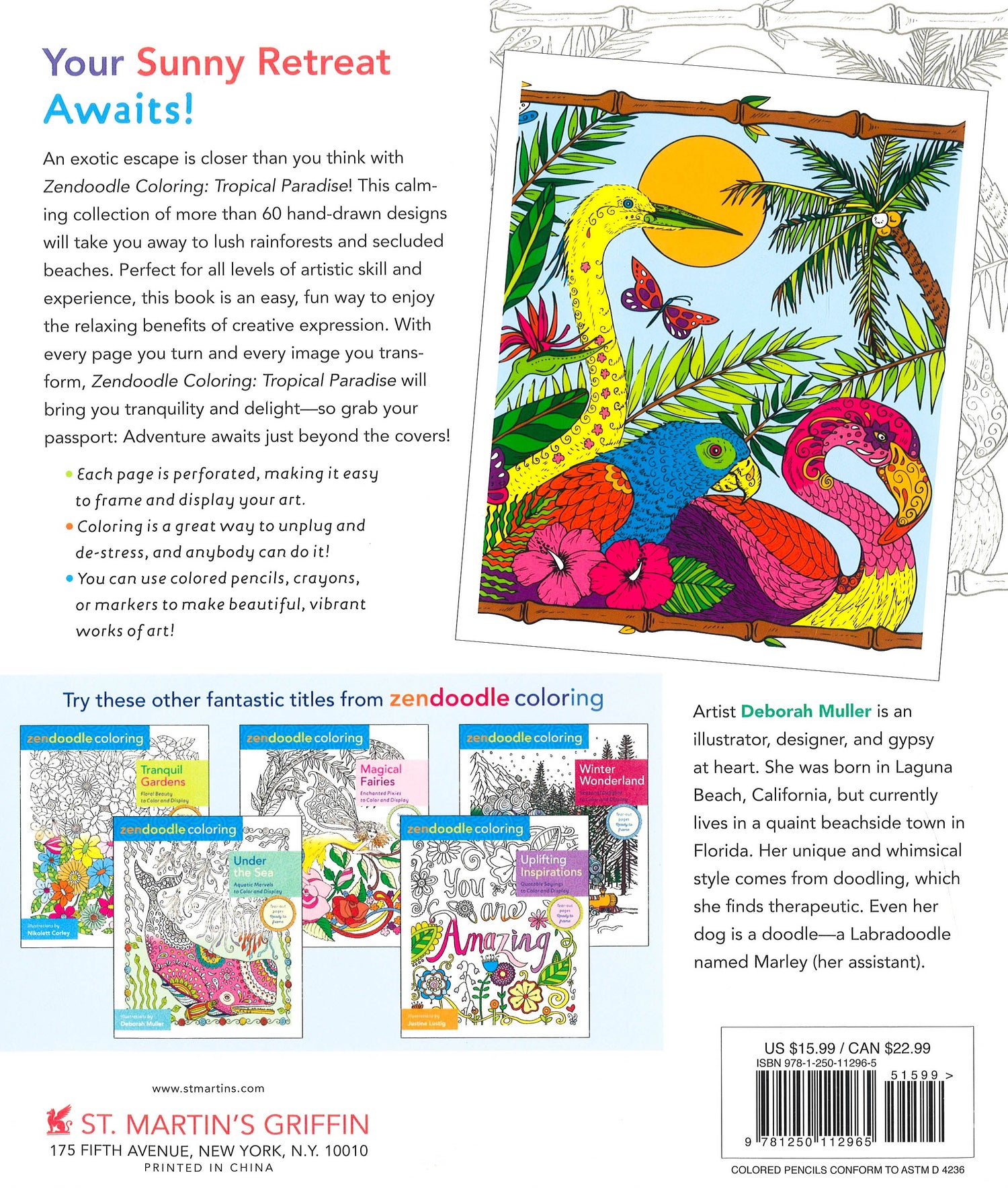 Your Sunny Retreat Awaits!Bask in the warmth and blissful calm of the tropics as you escape into rain forests and bamboo tiki huts covered with straw-thatched roofs. With more than 60 images celebrating the warmer, sultrier climes you'll almost smell the rich, mossy undergrowth and the salty, sea air as you color and shade each scene to perfection. Zendoodle Coloring: Tropical Parade will find you lost in your own Shangri-La a with each page you turn and each image you transform - so grab your passport, adventure awaits just beyond the covers!- Contains 6 double-sided colored pencils- Each page is perforated, making it easy to frame and display your art- You can use colored pencils, crayons, or markers - there is no right or wrong way to do it!- Coloring is a great way to unplug and de-stress, and anybody can do it!- Part of a New York Times bestselling coloring series!