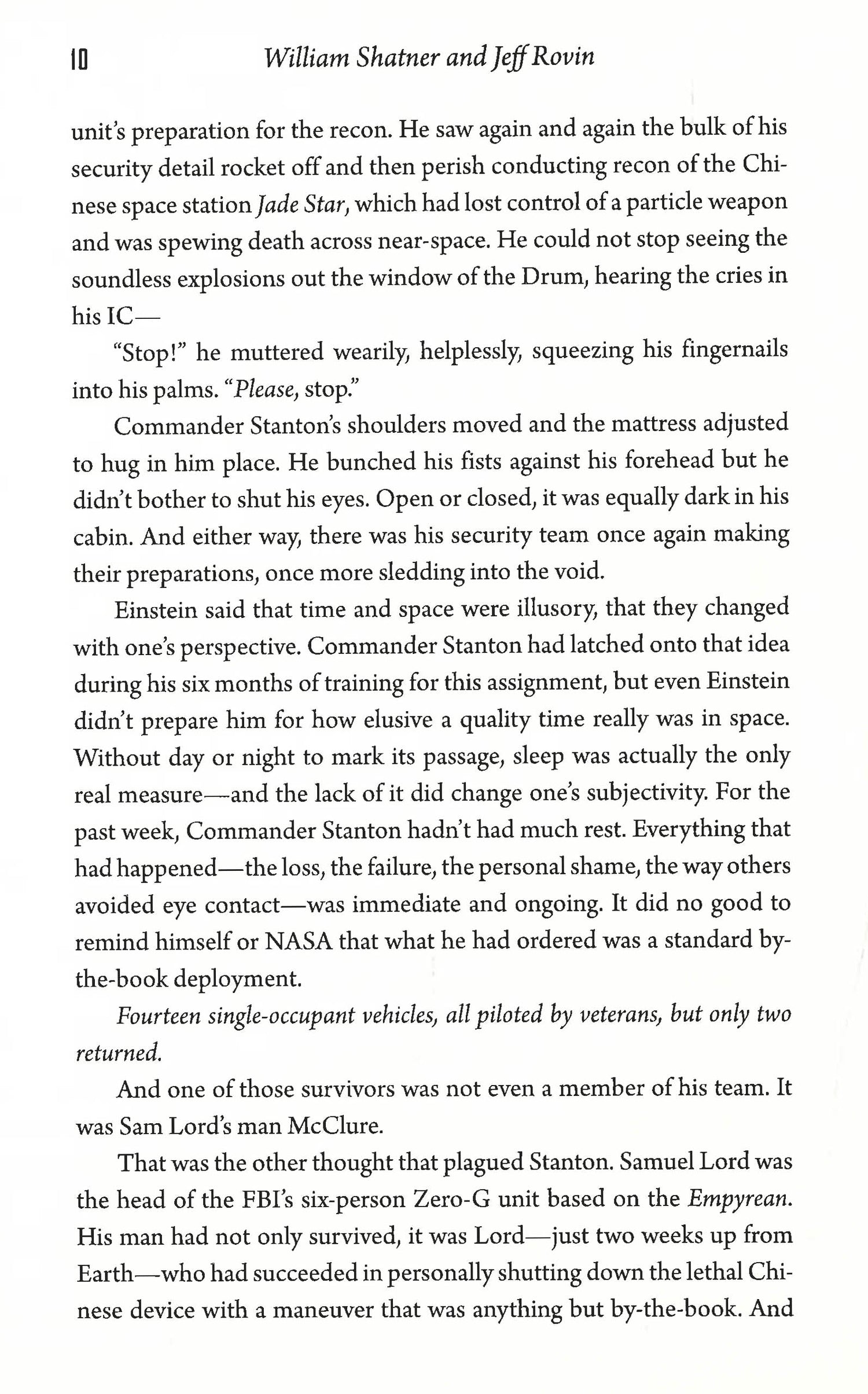 In the second installment of William Shatner's Zero-G series, Director Samuel Lord must identify a mole sabotaging the top-secret NASA project aboard the US space station Empyrean, while also fighting a fast-replicating virus that threatens humanity. In the year 2050, the United States sends the FBI to govern its space station, The Empyrean. Under the command of suave, eighty-year-old director Samuel Lord, the "Zero-G" men are in charge of investigating terrorism, crime, corruption, and espionage, keeping an eye on the rival Chinese and Russian stations as well. Lord and his team are assisting NASA in conducting a top-secret project in the agricultural center of the Empyrean. Using microscopic robots called nanites, they plan to construct a vine that can survive in space. The vine will grow structural material for an elevator that will reach from the Empyrean to Earth. Unfortunately, a Russian spy inadvertently causes the growth to rage out of control, not only threatening the Empyrean, but the Russian space station Red Giant. Under the guidance of Director Samuel Lord, Zero-G must not only identify the spy, but help find a way to stop the fast-replicating vine...and a form of "space zombie" birthed by the nanites. The surprising solution takes Lord and a Russian pilot on a dangerous mission to Venus-where a shocking discovery awaits.