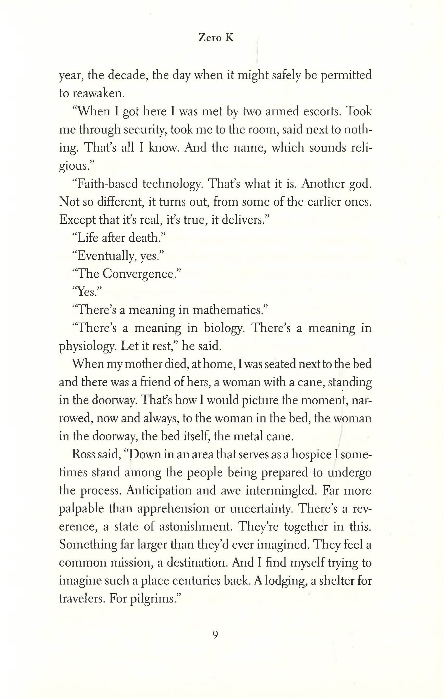 Jeffrey Lockhart's father, Ross, is a billionaire in his sixties, with a younger wife, Artis Martineau, whose health is failing. Ross is the primary investor in a remote and secret compound where death is exquisitely controlled and bodies are preserved until a future time when biomedical advances and new technologies can return them to a life of transcendent promise. Jeff joins Ross and Artis at the compound to say "an uncertain farewell" to her as she surrenders her body. We are born without choosing to be. Should we have to die in the same manner? Isn't it a human glory to refuse to accept a certain fate? These are the questions that haunt the novel and its memorable characters, and it is Ross Lockhart, most particularly, who feels a deep need to enter another dimension and awake to a new world. For his son, this is indefensible. Jeff, the book's narrator, is committed to living, to experiencing "the mingled astonishments of our time, here, on earth. Don DeLillo's seductive, spectacularly observed and brilliant novel Zero K weighs the darkness of the world -terrorism, floods, fires, famine, plague - against the beauty and humanity of everyday life; love, awe, "the intimate touch of earth and sun.