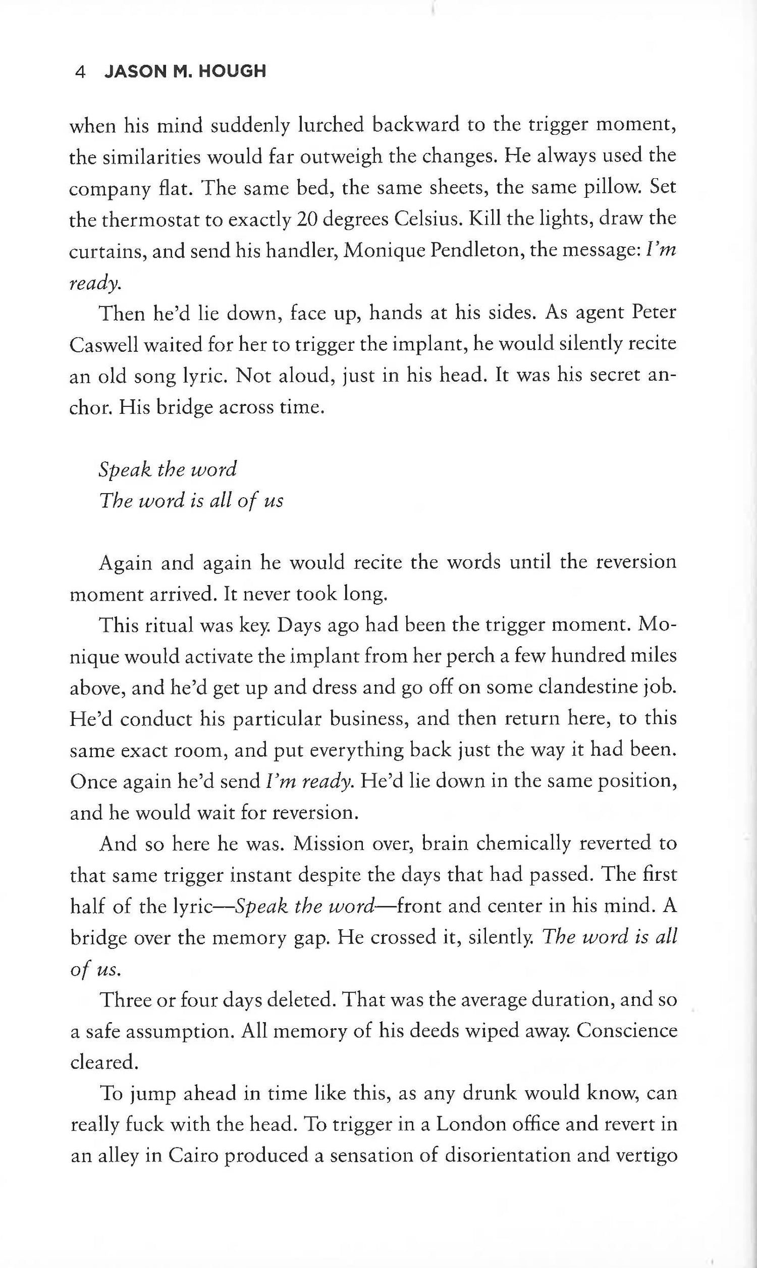 Published in rapid succession, Jason M. Hough s first three novels, "The Darwin Elevator, The Exodus Towers, "and" The Plague Forge, "earned mountains of praise and comparisons to such authors as James S. A. Corey and John Scalzi. Now Hough returns with a riveting near-future spy thriller that combines the adrenaline of a high-octane James Bond adventure with mind-blowing sci-fi speculations worthy of Christopher Nolan s "Inception."