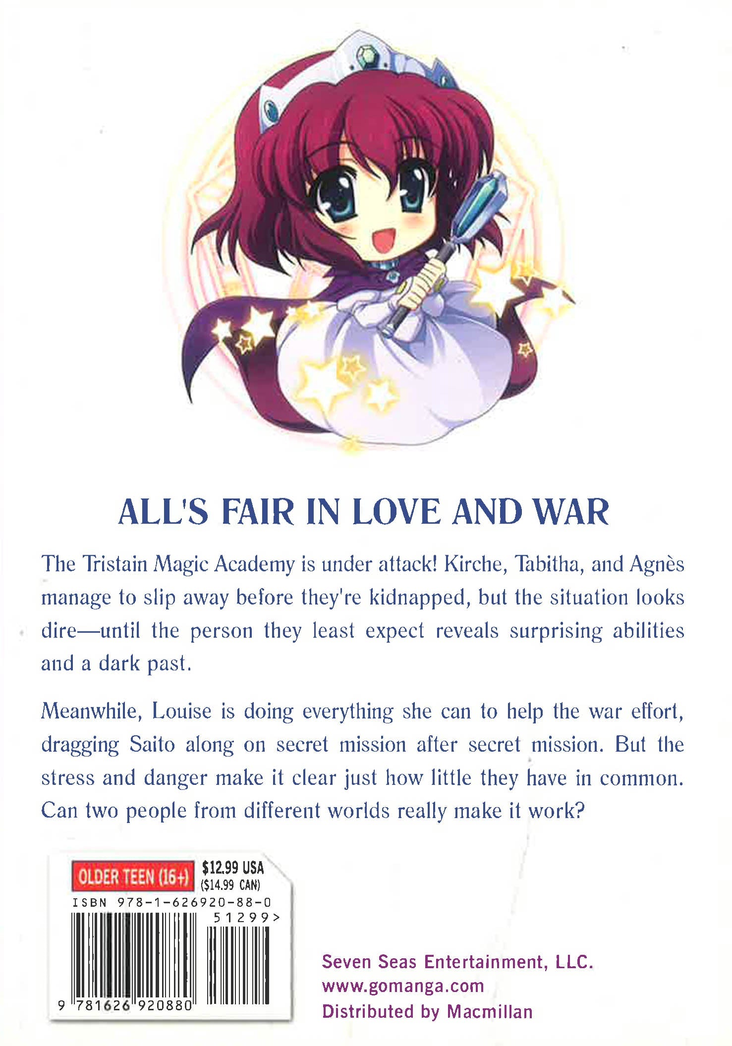 All's Fair in Love and War The Tristain Magic Academy is under attack! Kirche, Tabitha, and Agnès manage to slip away before they're kidnapped, but the situation looks dire—until the person they least expected reveals surprising abiltiies and a dark past. Meanwhile, Louise is doing everything she can to help the war effort, dragging Saito along on secret mission after secret mission. But the stress and danger make it clear just how little they have in common. Can two people from different worlds really make it work?
